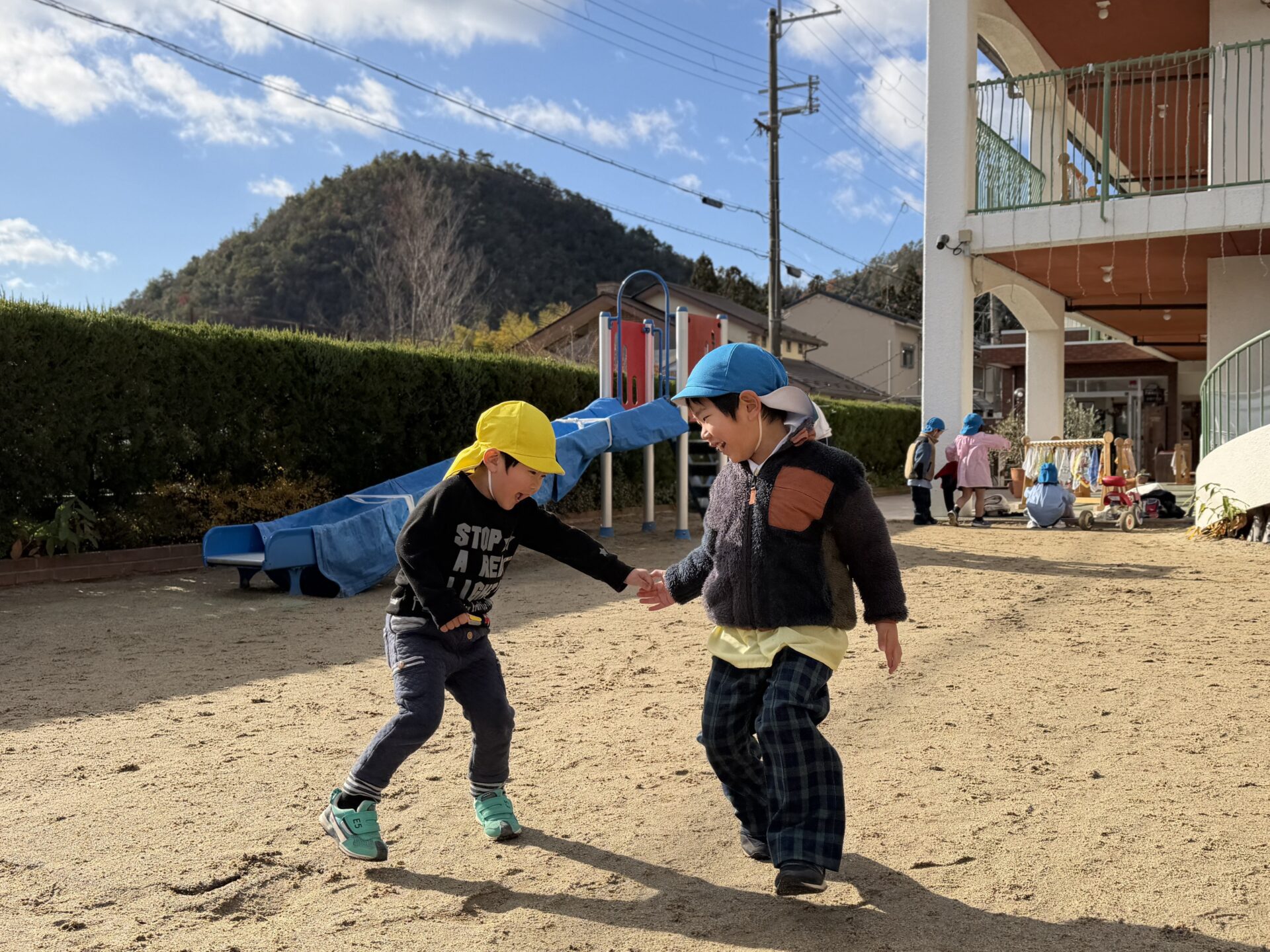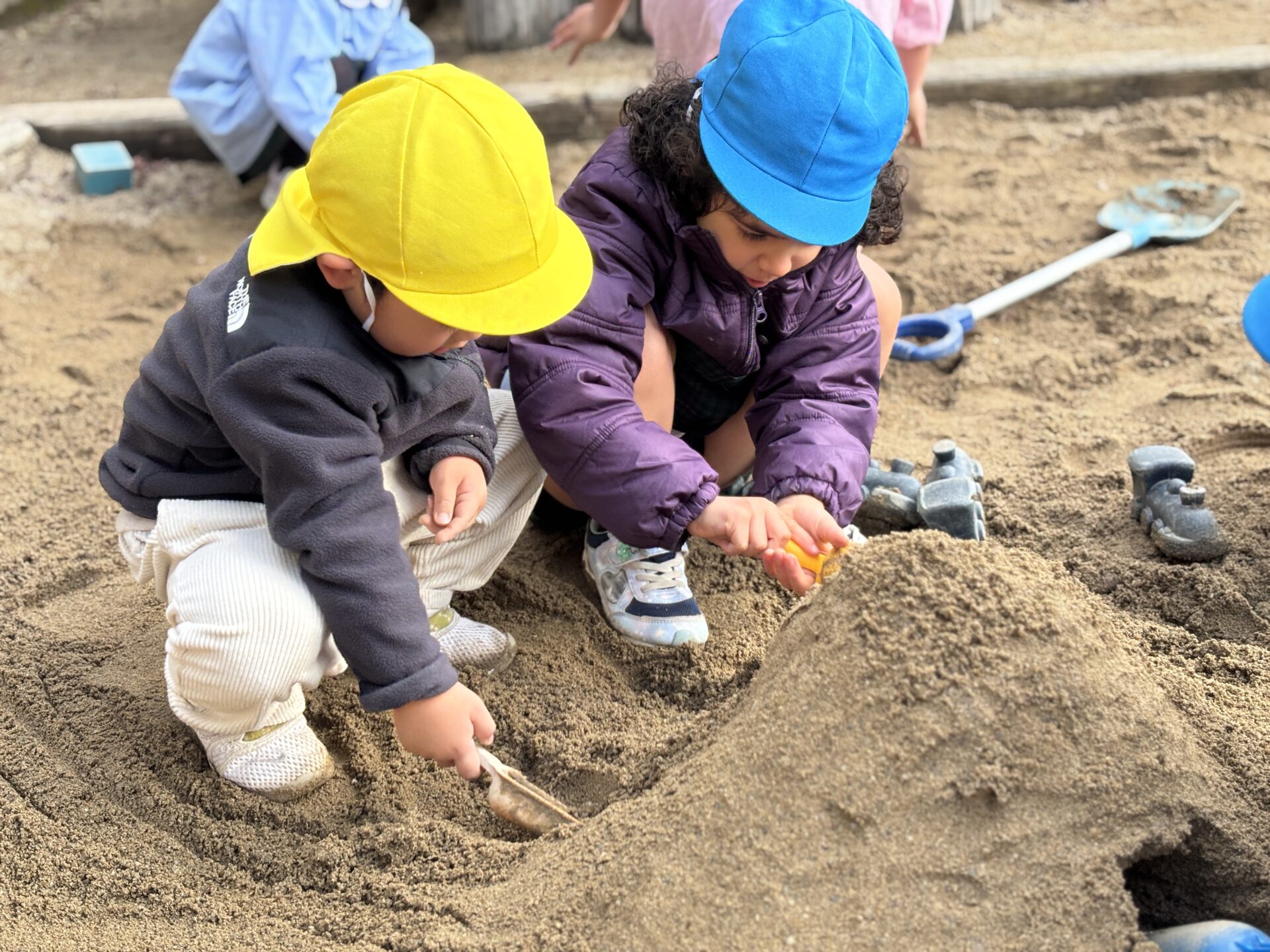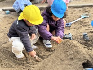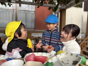 ちゅうりっぷ組(2歳児)とゆり(年中)組のお友だちが園庭で遊びました。「まてまて~!」と言いながら追いかけっこをしたり、「ごはんできたよ!」「いただきま~す!」とお話しながらおままごとをしたりと、笑顔いっぱいのみんな☆お天気もよく、元気いっぱい遊びました♪