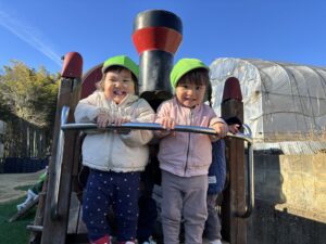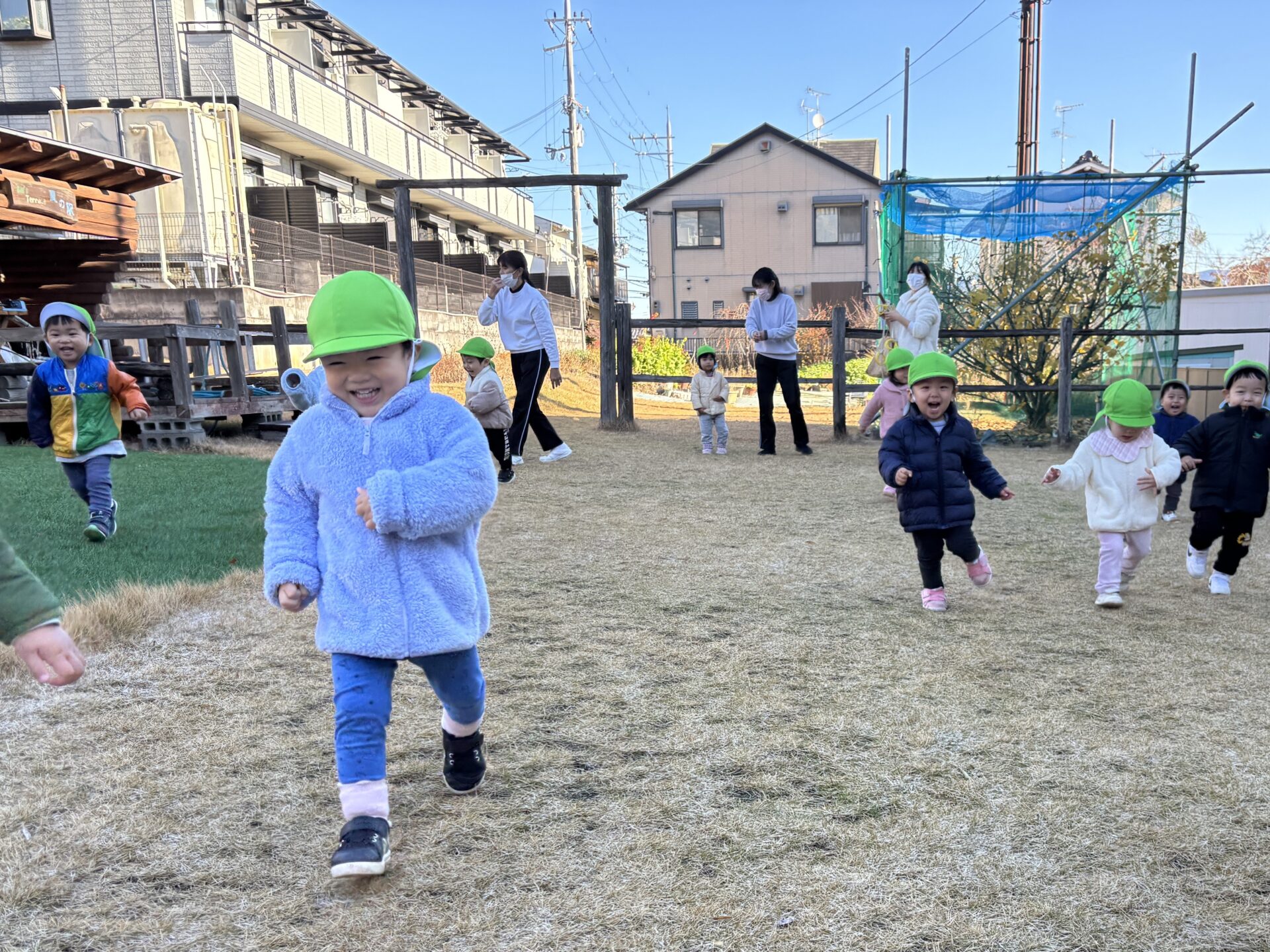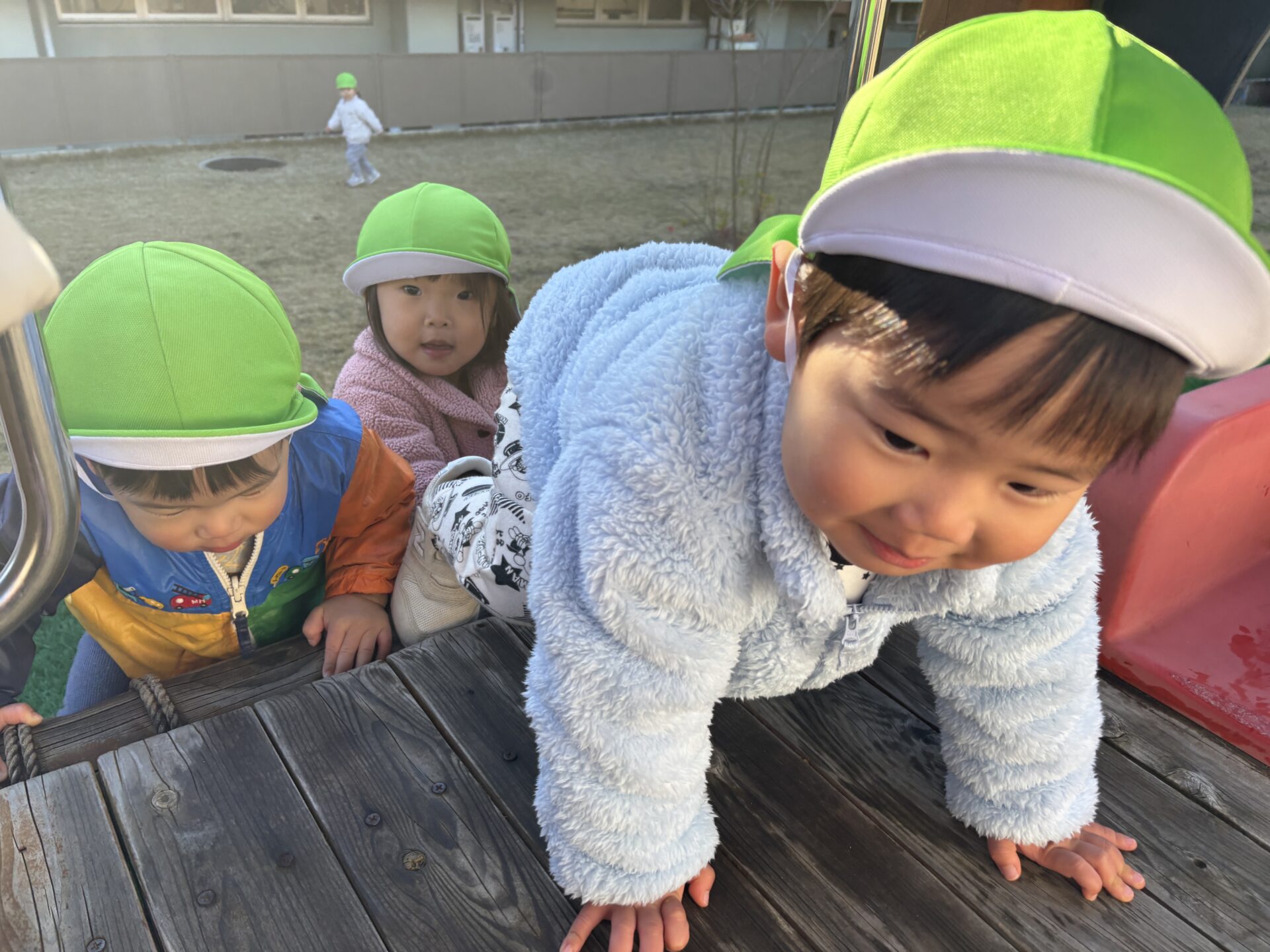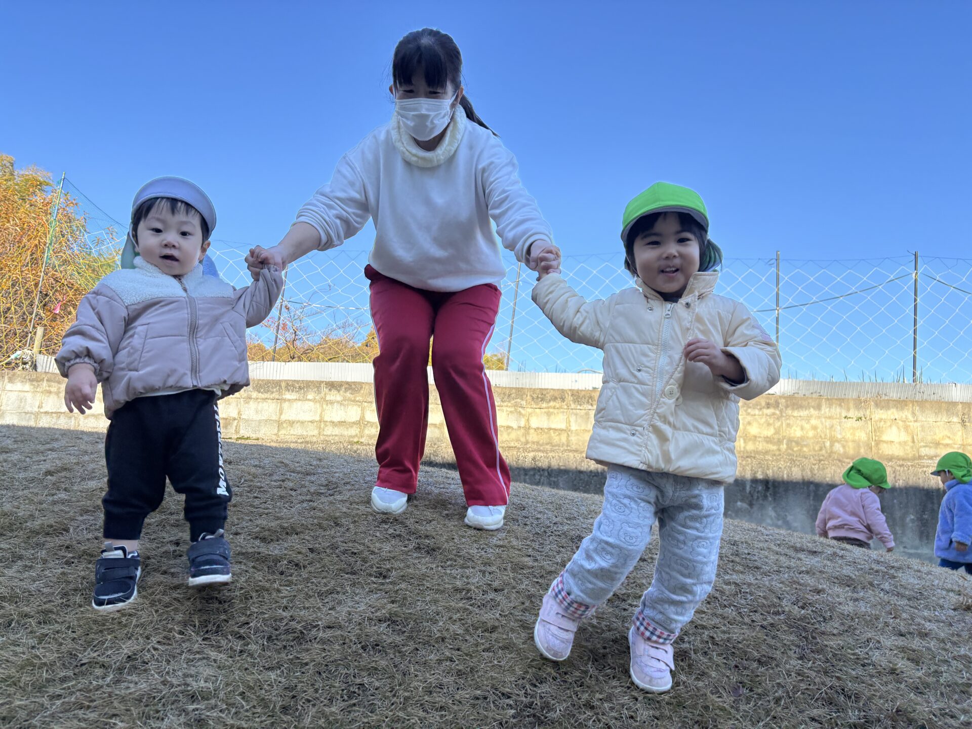 たんぽぽ2組(1歳児)のお友だちが、芝生広場で遊びました。お友だちや先生とかけっこをしたり、お山にのぼったりと、体を動かして元気いっぱいに遊んだ子どもたち☆遊具にも上手に上がれるようになり、ニコニコ笑顔をたくさん見せてくれました♪