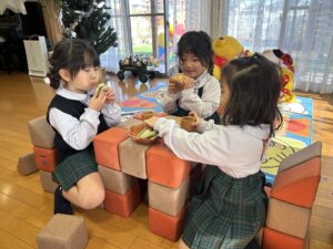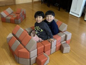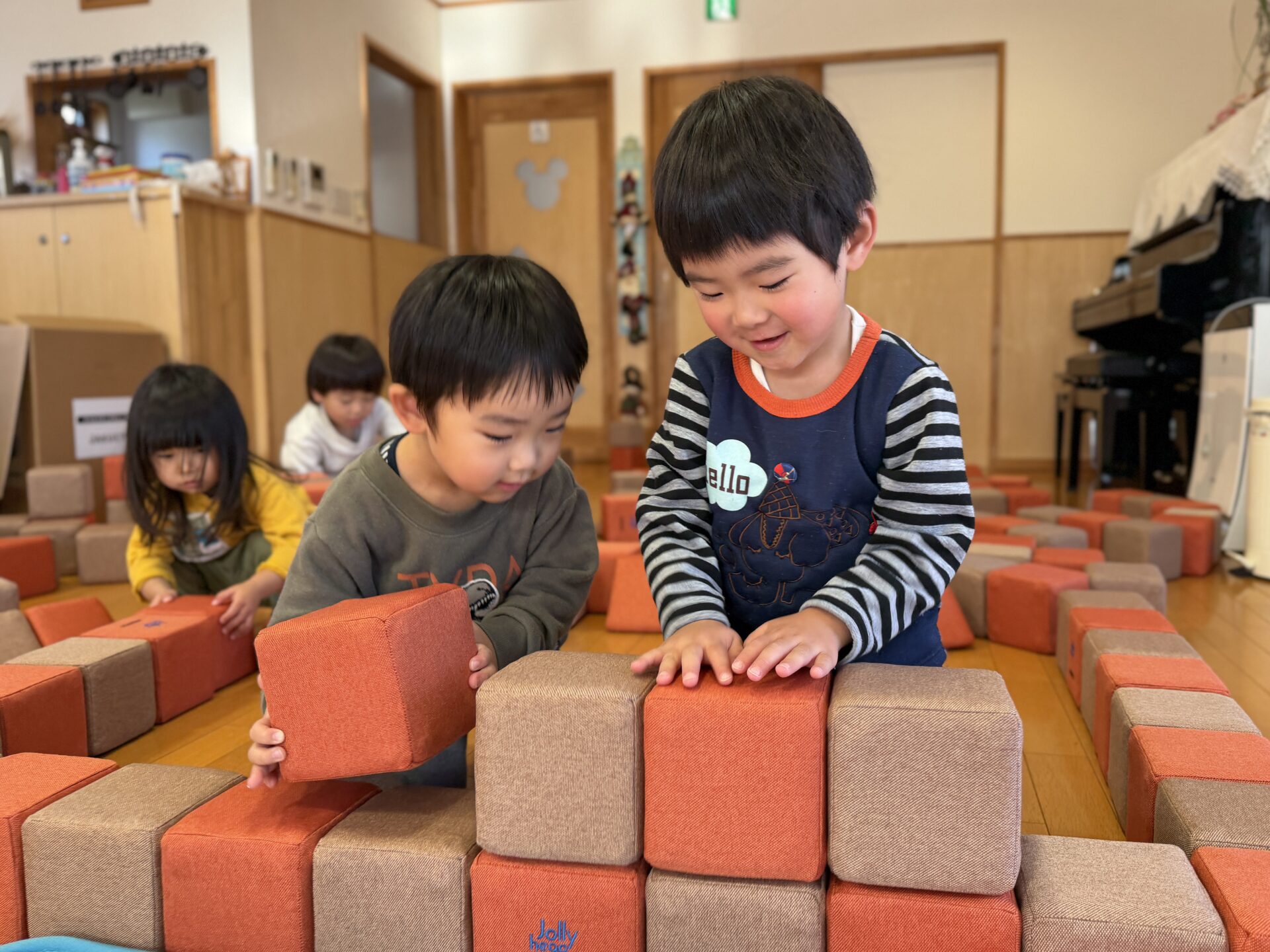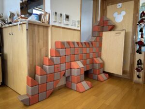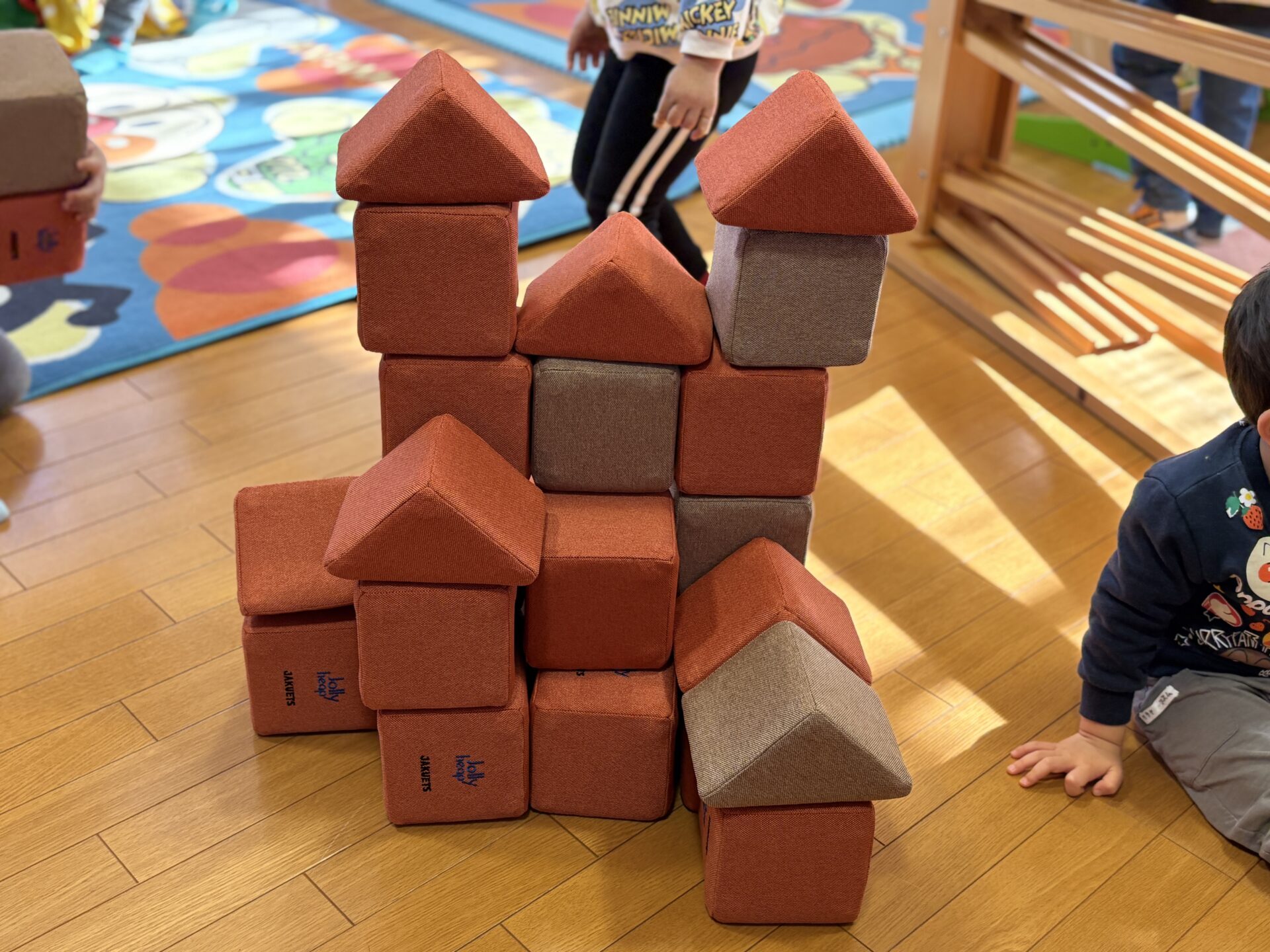 さっそく、ちゅうりっぷ組(2歳児)、さくら(年少)組、ゆり(年中)組、うめ(年長)組のお友だちが遊びました。作り方の説明書を見ながら、「次は三角の形がいるよ」「ここはオレンジだから、次ははいいろをくっつけよう!」と声を掛け合い、協力する姿が見られました。また、「机作ってみたよ~」と、自分たちで考えた形を作る姿もあり、想像をふくらませながら楽しく遊んでいました♪