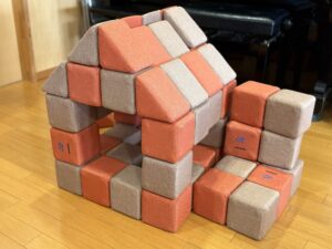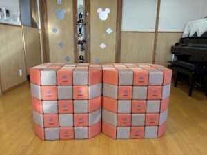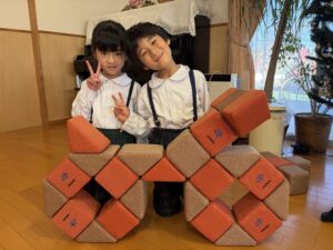 友遊館に、新しいおもちゃが仲間入りしました。その名も『クリエイティブキューブ』!布製のキューブ型クッションの中に磁石が入っており、くっつけたり積み上げたりして遊べるおもちゃです。