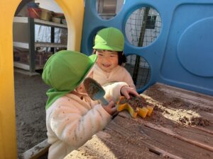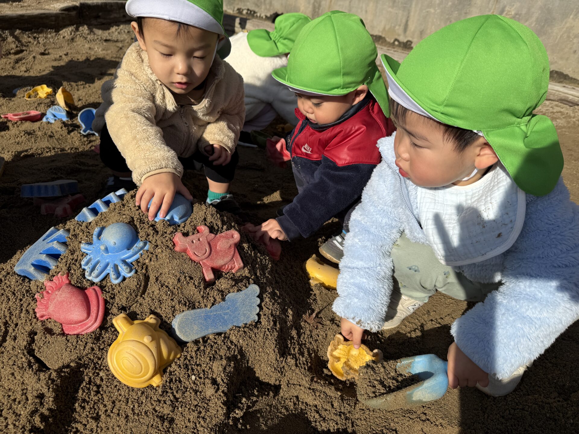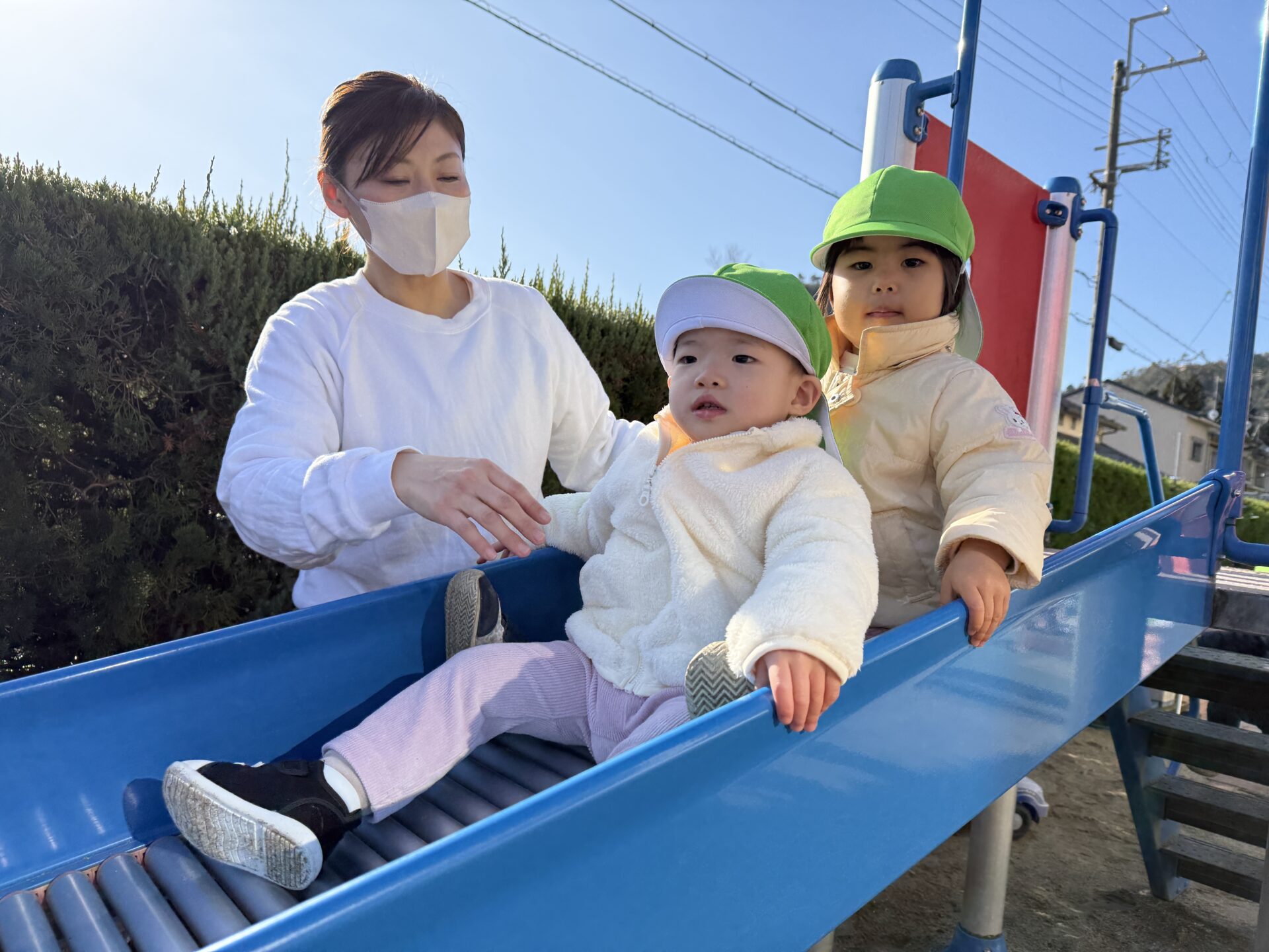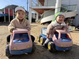 たんぽぽ2組(1歳児)のお友だちが、園庭で遊びました。ローラー滑り台をすべったり、砂場でお山を作ったりしながら、思い思いに楽しんでいた子どもたち☆他にも、おもちゃの車に乗ってお友だちと一緒に走ったりと、元気いっぱい遊んでいました♪