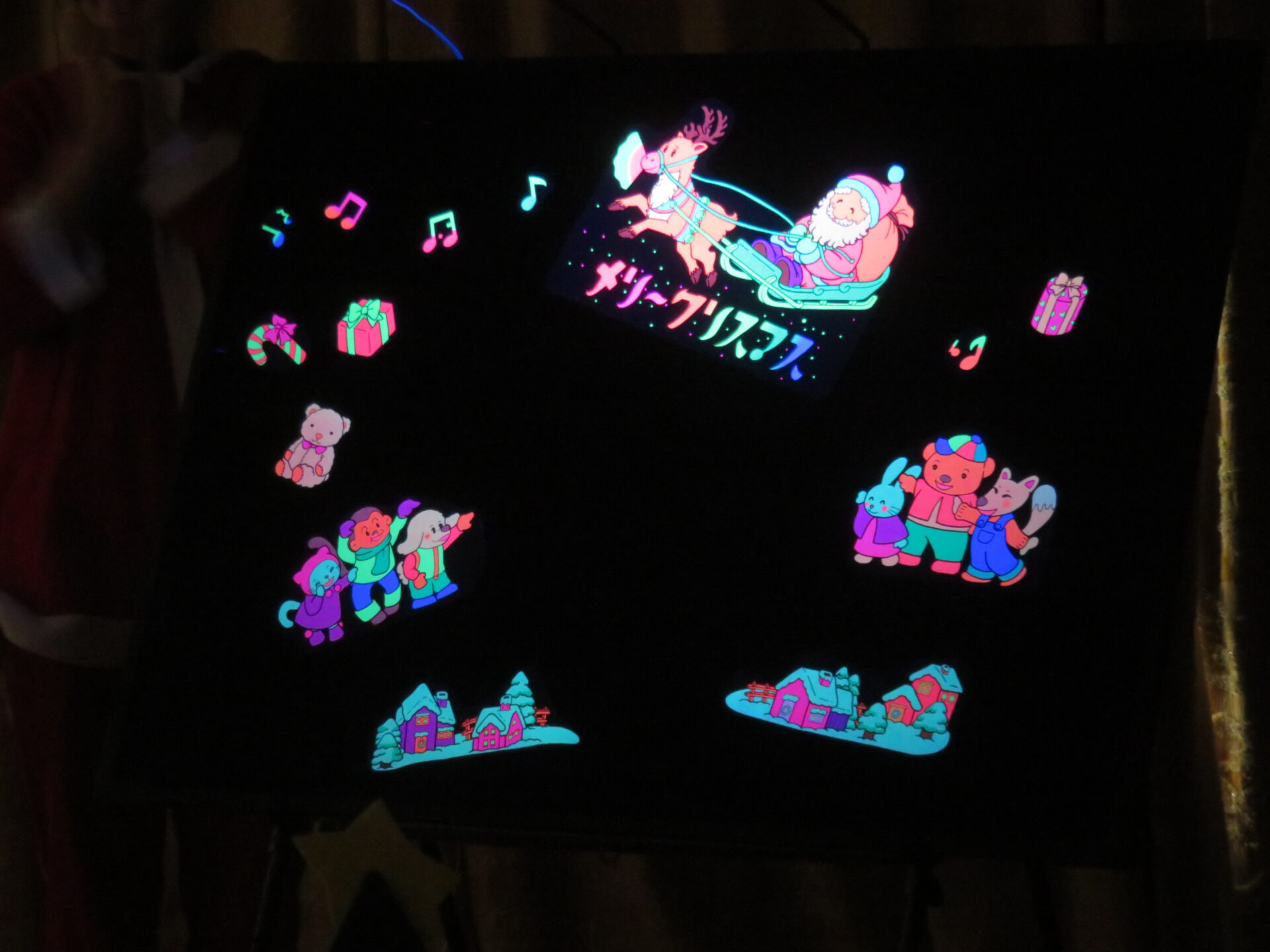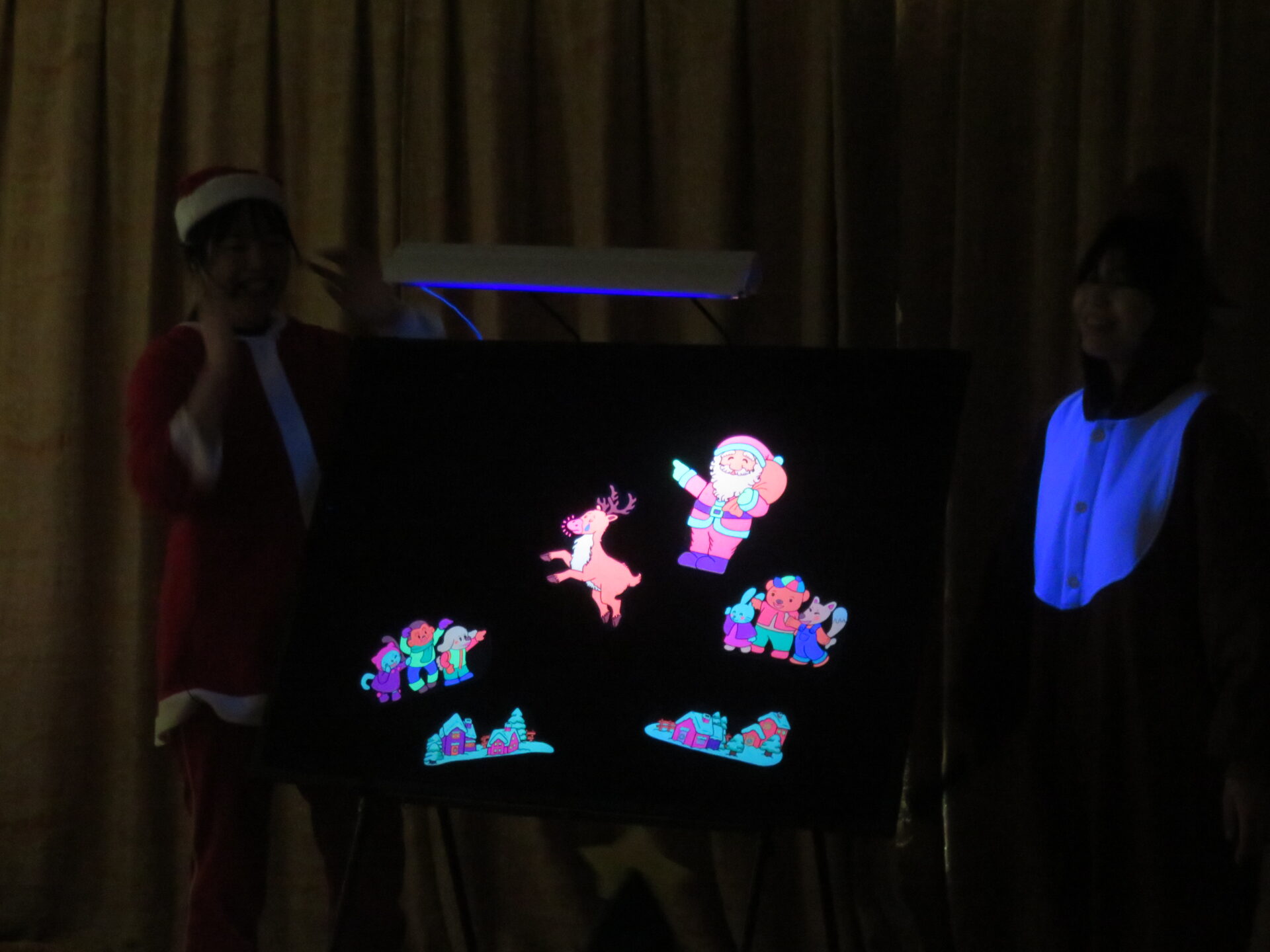 はじめに、先生からのプレゼントとして『♪赤鼻のトナカイ♪』のブラックパネルシアターを見ました。(黒いボードに、蛍光絵の具で色を塗った不織布の人形を貼ったり外したりしながら演じるお話や歌遊びです。)歌に合わせてサンタさんやトナカイさんが次々と登場すると、子どもたちは目を輝かせ、口ずさみながら楽しんでいました☆