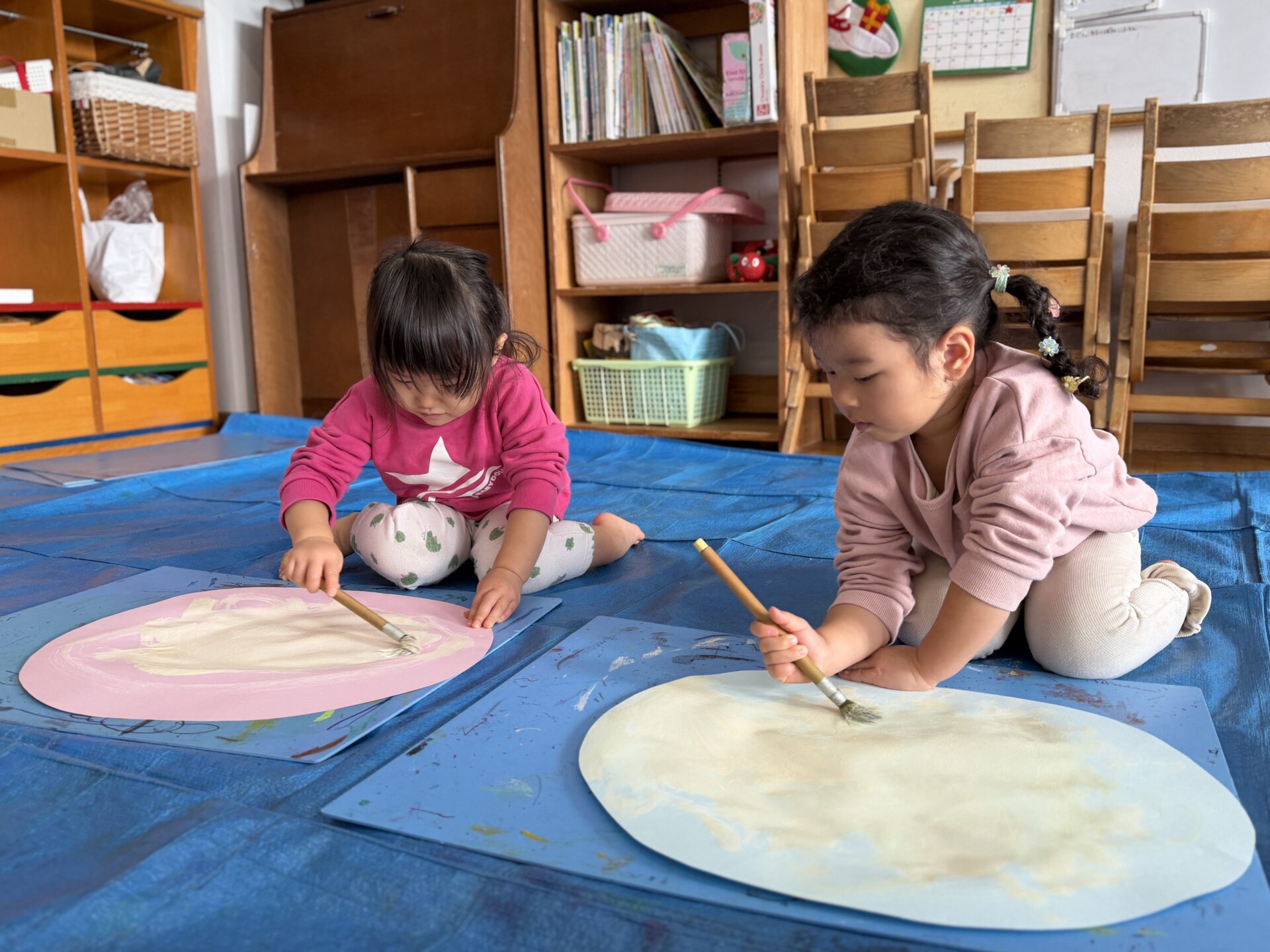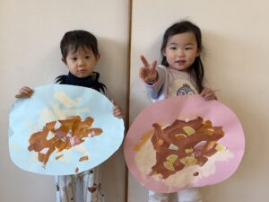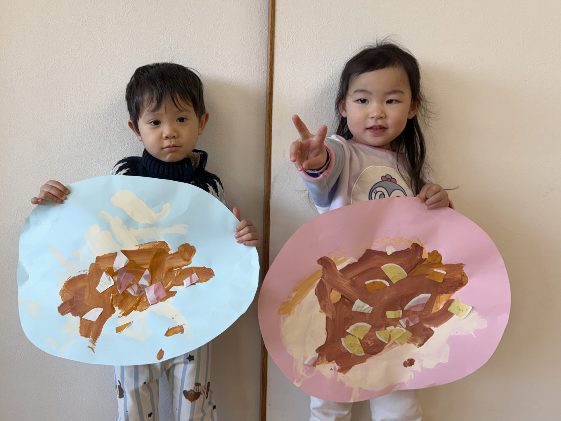 今日は、ごはんに見立てた白い絵の具をお皿にぬり、その上から茶色の絵の具でルーをそっと重ねました。最後に、昨日切った野菜やお肉をトッピングすると、おいしそうなカレーライスができあがりました☆
