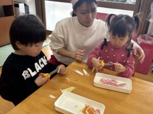 昨日は、買い物ごっこをしながら、カレーに入れるジャガイモ・玉ねぎ・にんじん・お肉のイラストを選び、はさみを使ってチョキチョキ切りました。