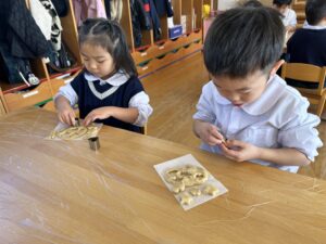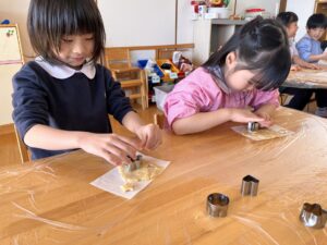 今日のおやつは、クッキーでした。ゆり(年中)組、うめ(年長)組のお友だちが、型抜きに挑戦しました!まずは生地を手で広げ、「どれにしようかな?」とお話しながら、好きな型を選んでいたみんな☆型を押すと「きれいに抜けたよ!」「次はどんな形にしようかな~!」と、わくわくした表情で楽しんでいました。