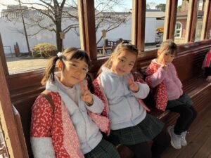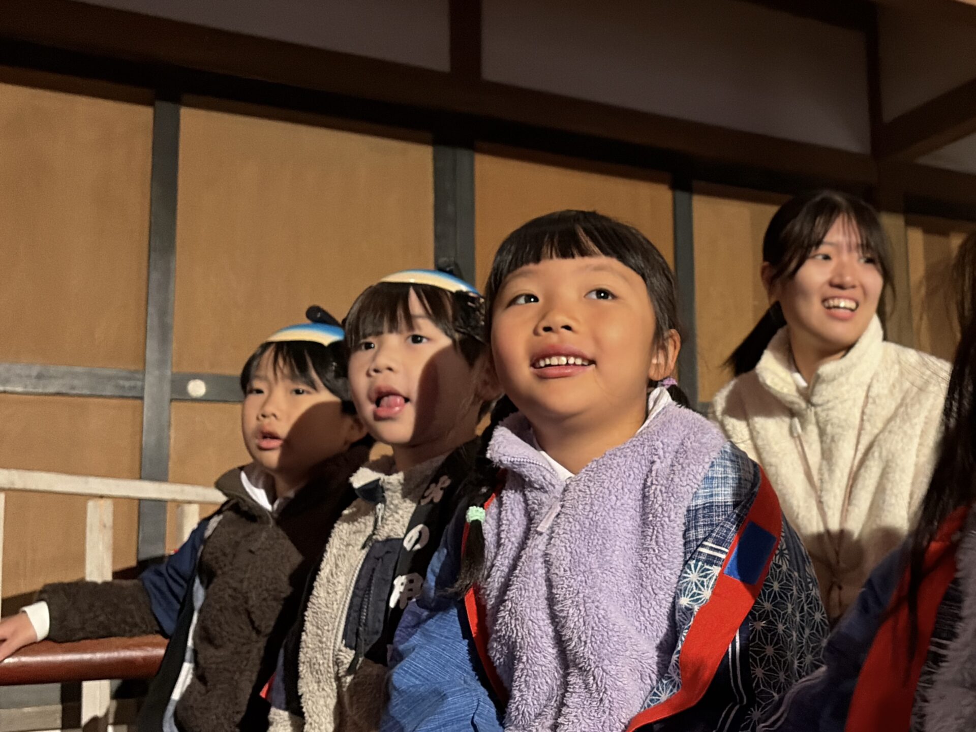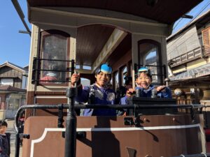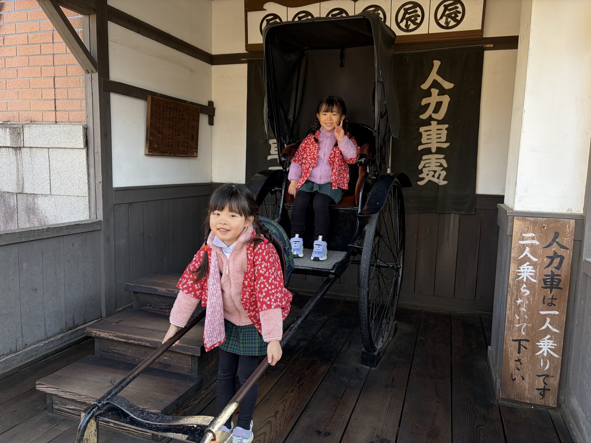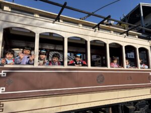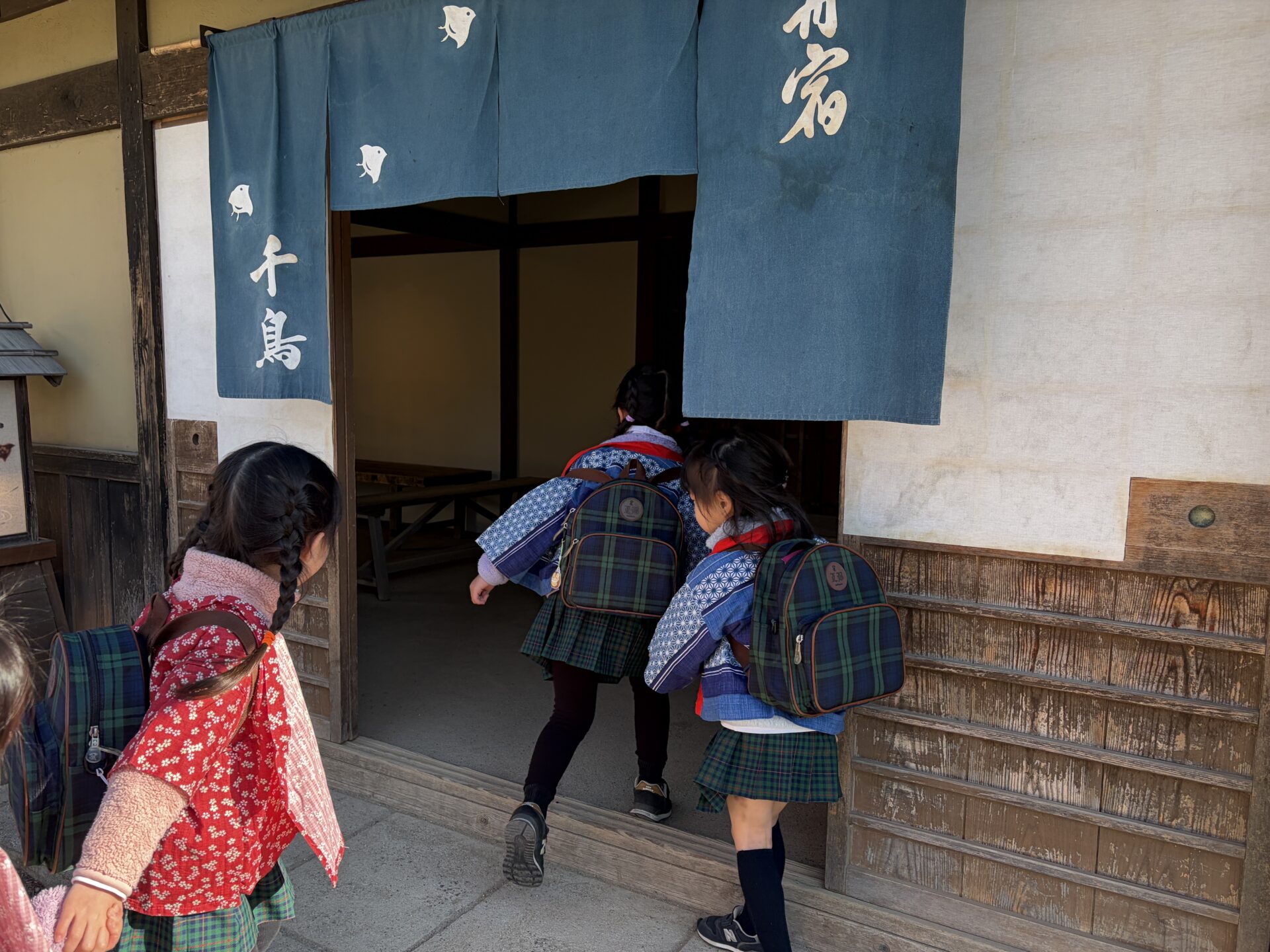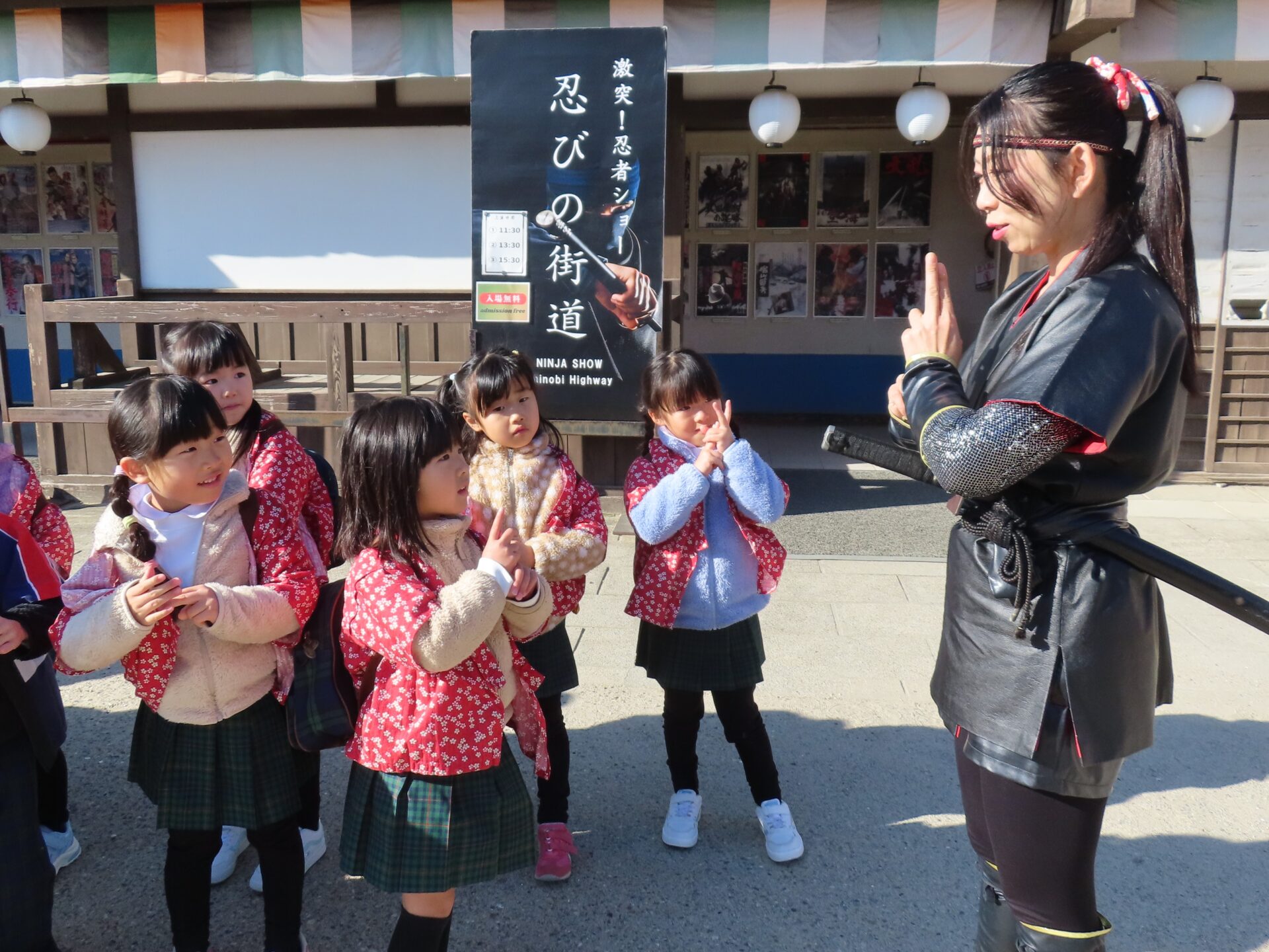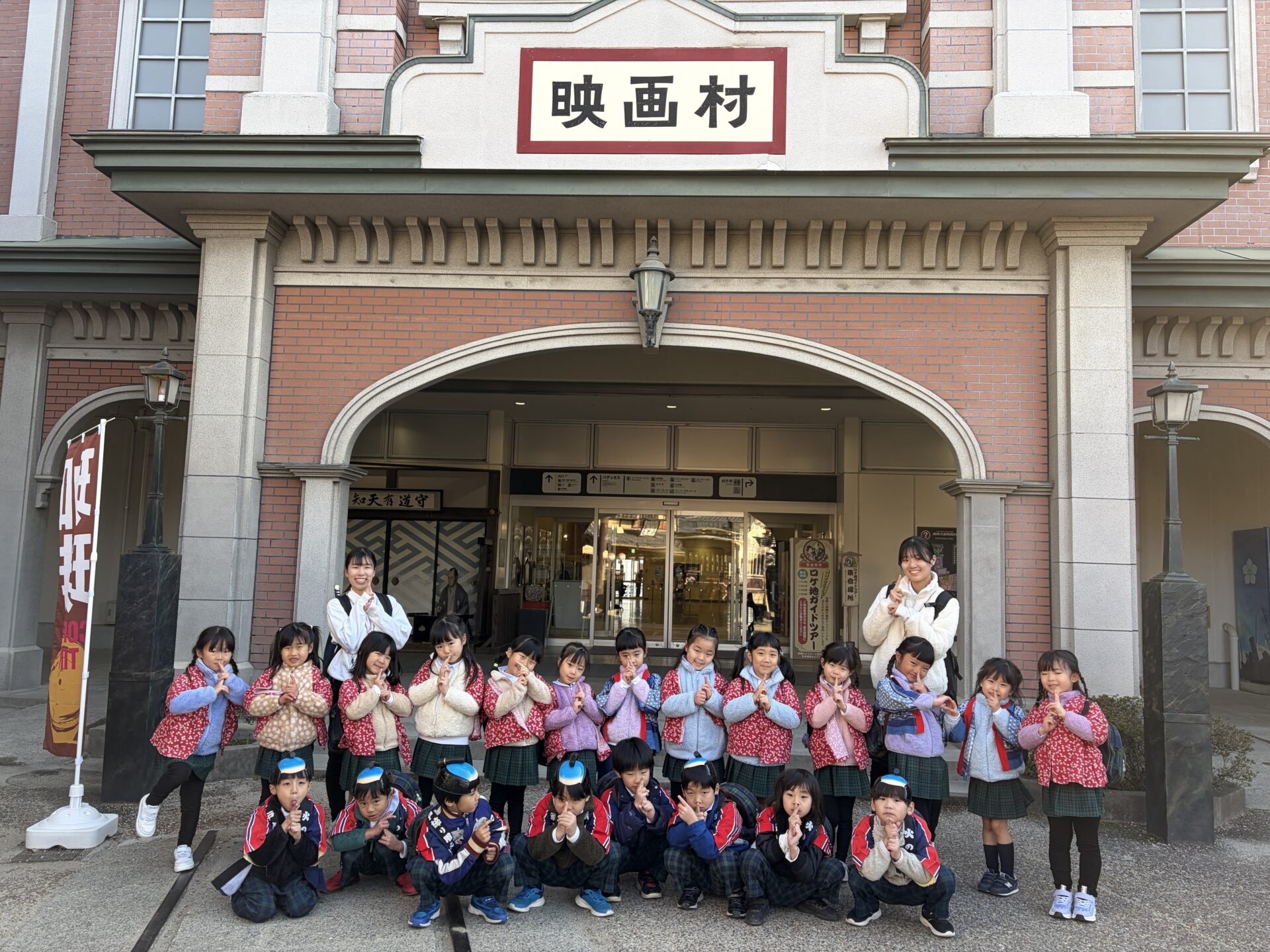 うめ(年長)組のお友だちが、園外保育で『東映太秦映画村』へ行きました。男の子はハッピにちょんまげのかつら、女の子はかわいい羽織りを身につけて、いざ入村!江戸の街並みを歩いたり、忍者にポーズを教えてもらったり、お侍さんとお話ししたりと、普段はできない特別な体験に大喜びの子どもたちでした☆