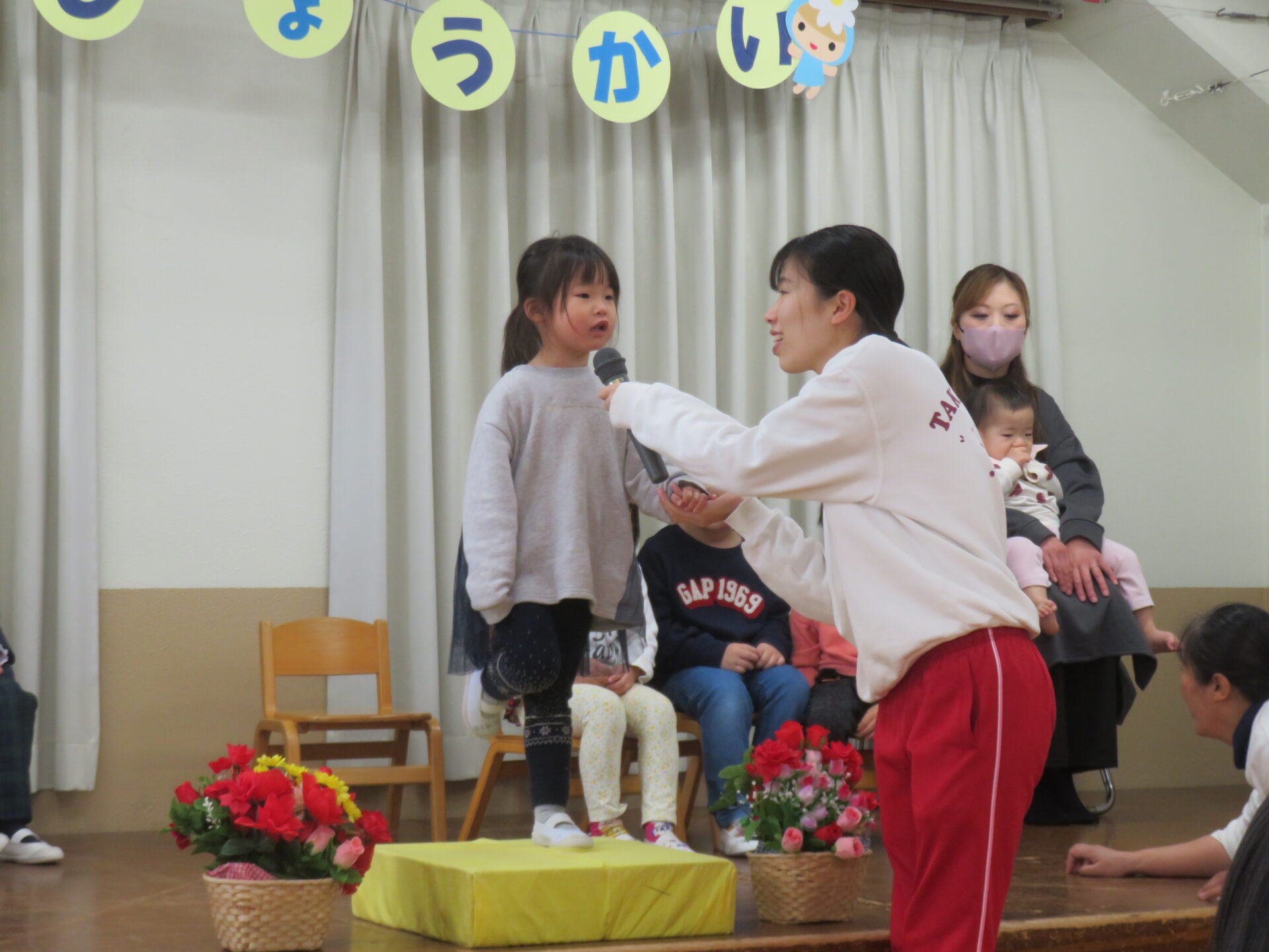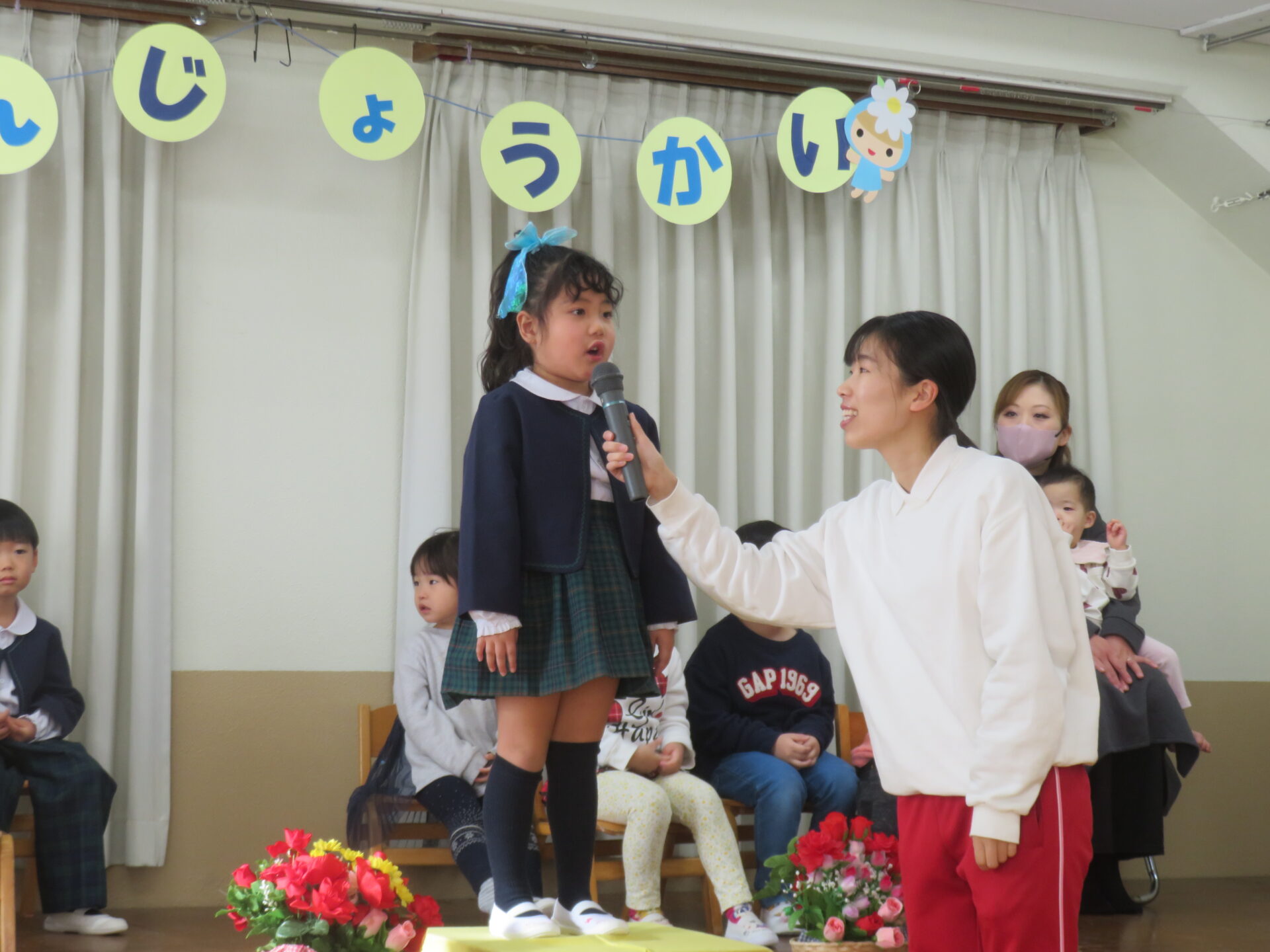 たんぽぽ2組(1歳児)のお友だちは、おにぎりといった『好きな食べ物』を、さくら(年少)組、うめ(年長)組のお友だちは、サッカー選手やバスの運転手など『将来の夢(大きくなったら何になりたいか)』を答えました。