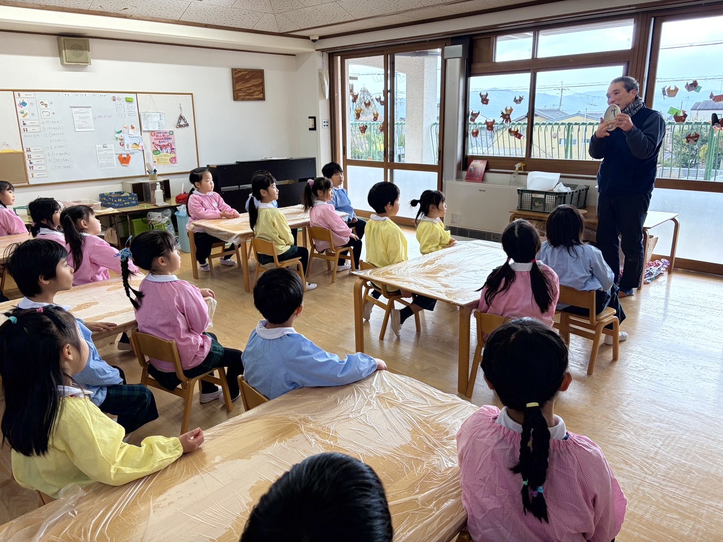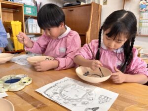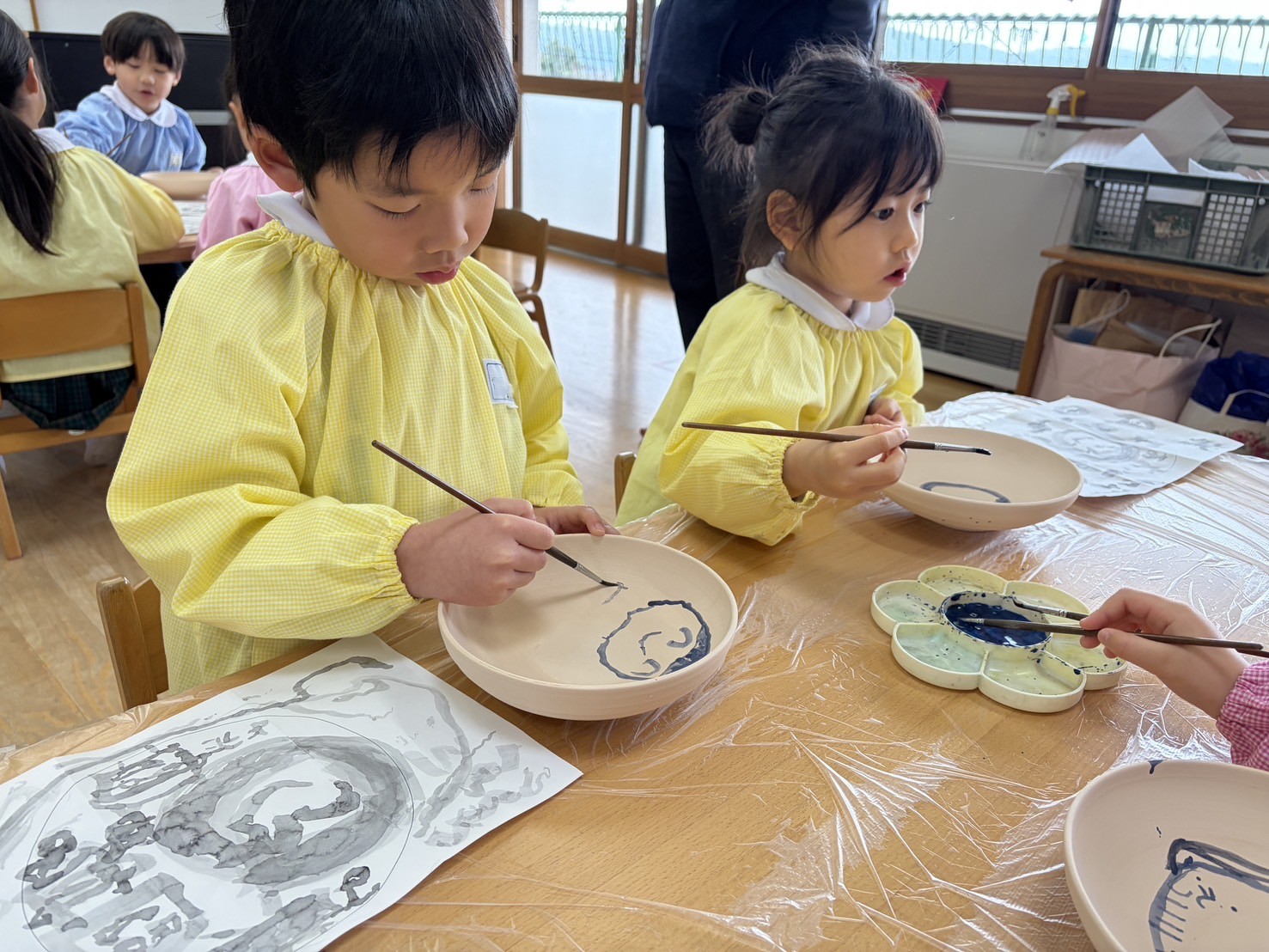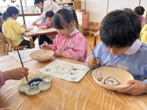 うめ(年長)組のお友だちが、卒園記念制作としてお皿の絵付けをしました。