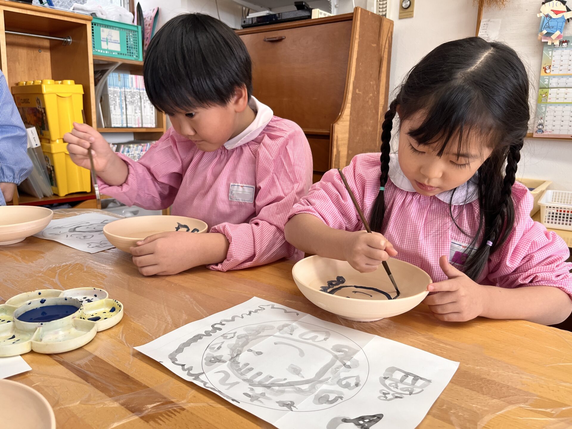 「お皿って曲がっているから難しいな~」と苦戦する姿も見られましたが、最後まで集中して取り組んでいました。表面には自分のお顔と名前、裏面にはそれぞれが考えた模様を描き、個性あふれる素敵な作品が完成しました☆