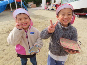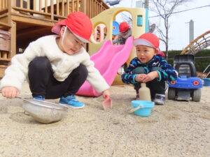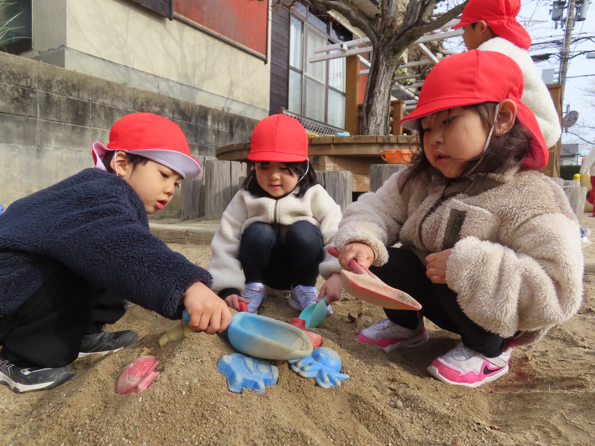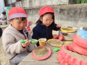 2026.01.15 園日記 笑顔いっぱい園庭あそび☆ さくら(年少)組のお友だちが、園庭で遊びました。お皿やカップに砂を入れて、「ごはんできましたよ☆」「おかわりもあるからね~!」とお話しながら、お店屋さんごっこを楽しんでいました♪ < 前へ 次へ > お知らせ・ブログ一覧へ