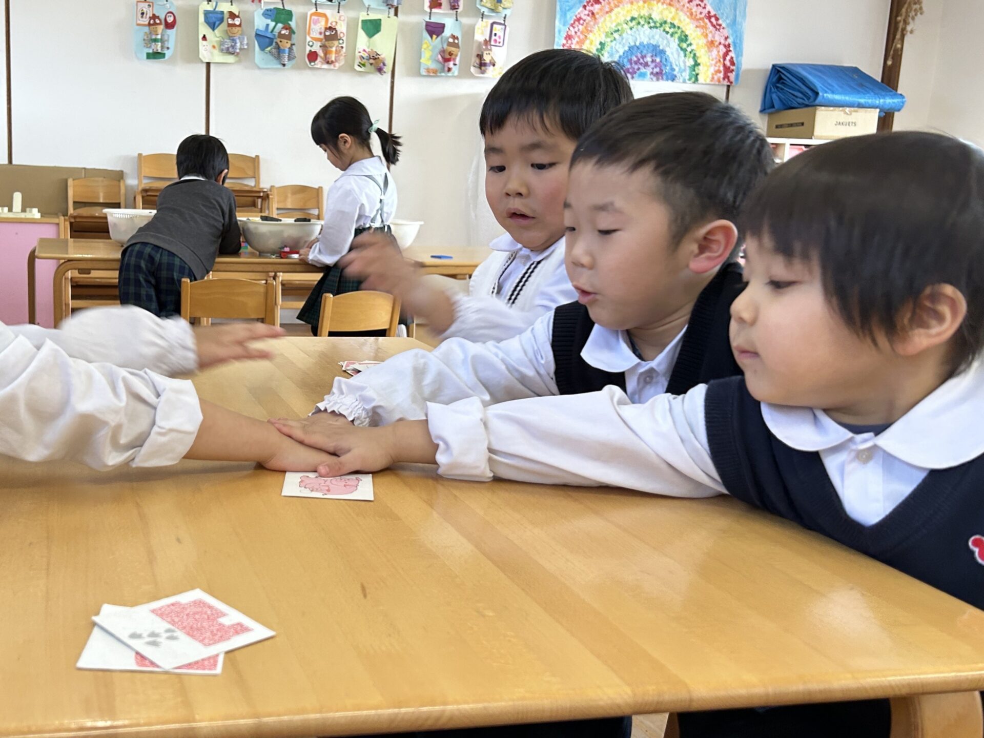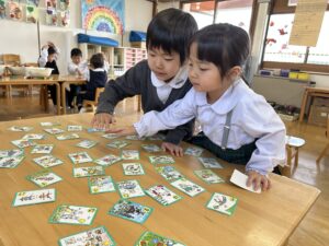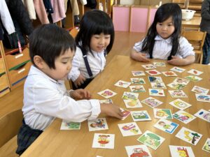 ゆり(年中)組のお友だちが、かるた遊びをしました。 読み札の言葉に耳を傾けながら、「これかな?」「あった!」と絵札を探していたみんな☆ 最近はひらがなへの興味も高まり、知っている字を見つけて嬉しそうにする姿が見られ、遊びの中で自然と文字に親しんでいます!これからも、楽しみながら言葉や文字に触れられる遊びを大切にしていきたいと思います。