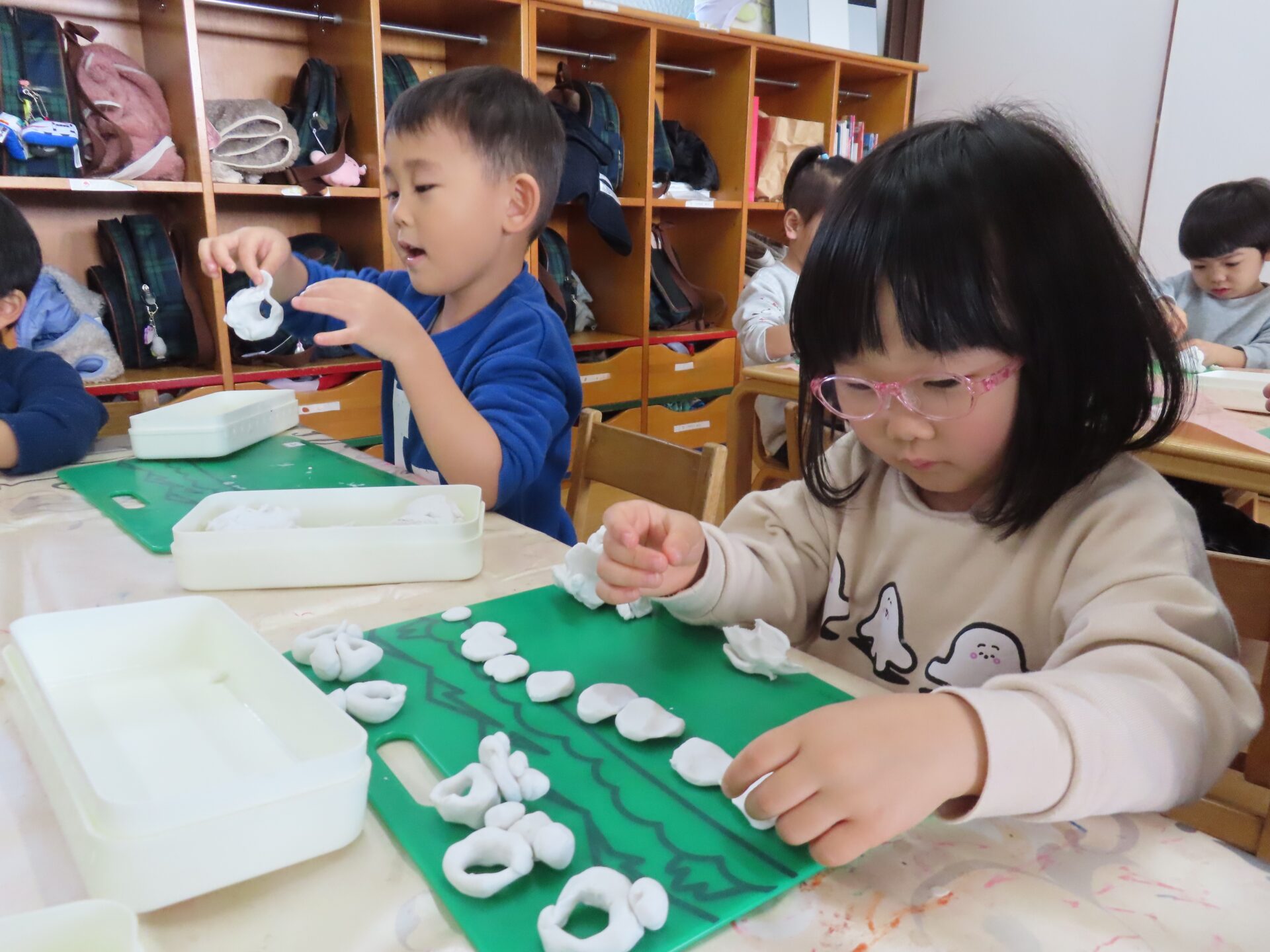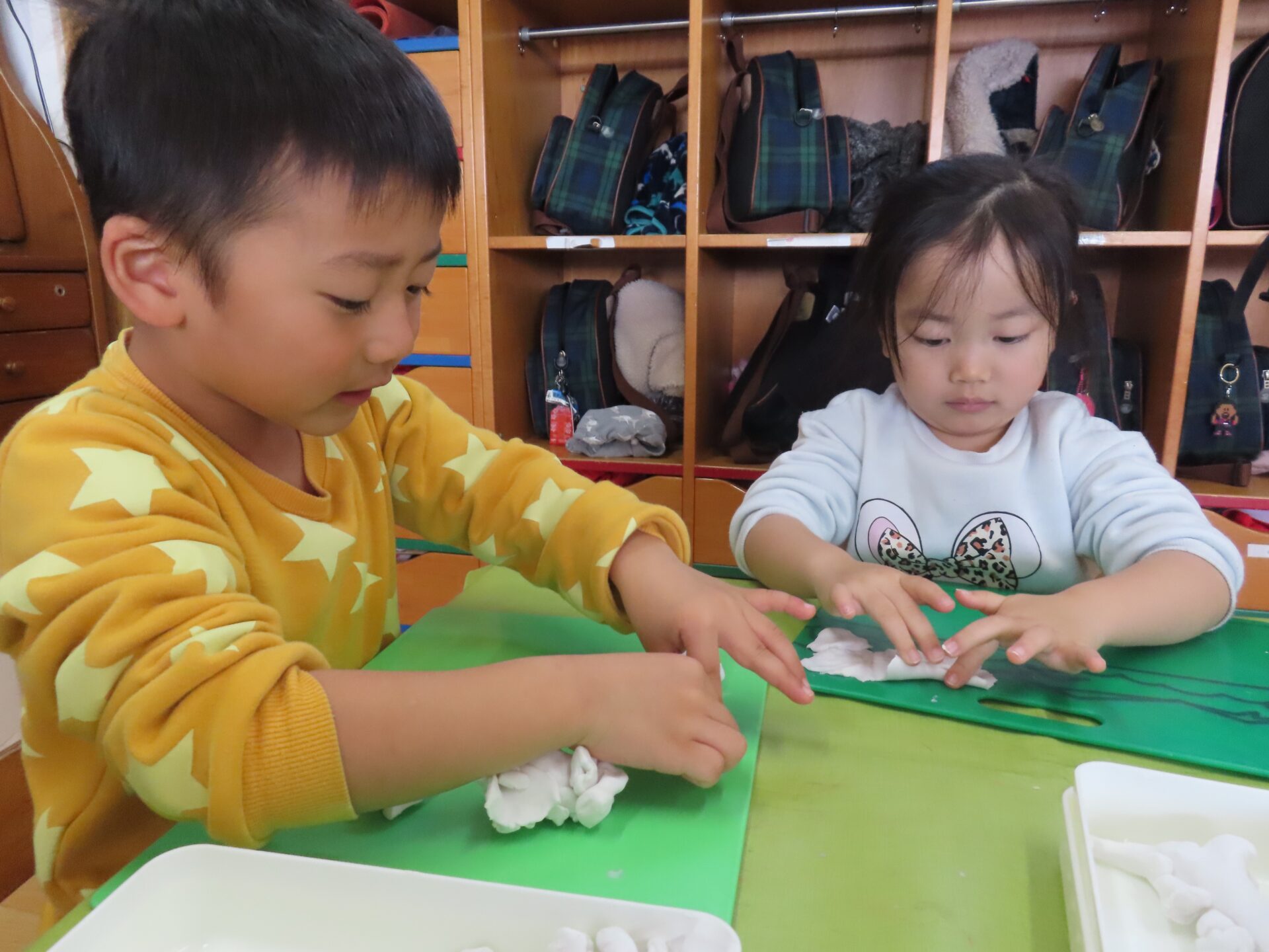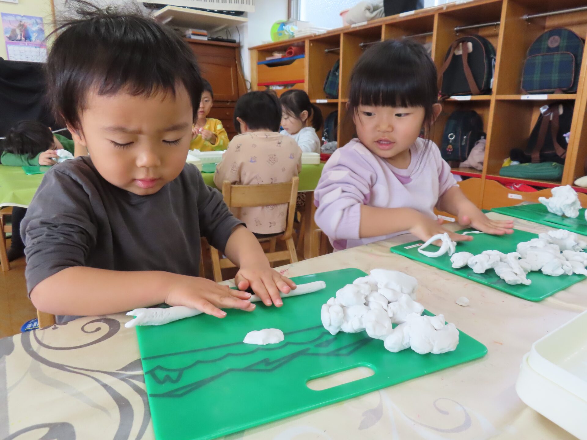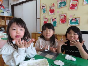 2026.01.20 園日記 くるくる・のばして♪粘土あそびをしたよ! さくら(年少)組のお友だちが、粘土遊びをしました。両手で細く伸ばしてうどんやラーメンを作ったり、くるっと丸めて指輪にしたりと、思い思いに楽しんでいたみんな。お友だちと見せ合いっこする姿も見られました☆ < 前へ 次へ > お知らせ・ブログ一覧へ