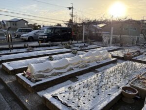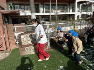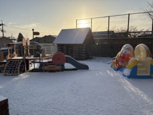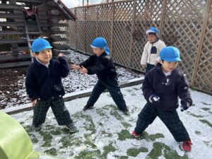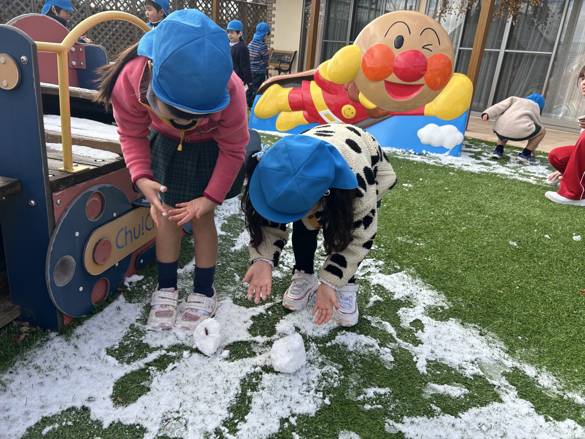 ゆり(年中)組のお友だちが新園庭で雪遊びをしました。真っ白な雪を前に、「つめたいね!」「ふわふわ~!」と大喜びの子どもたち!雪を丸めて小さな雪だるまを作ったり、そっと触って感触を確かめたりしながら、冬ならではの遊びを思いきり楽しみました♪