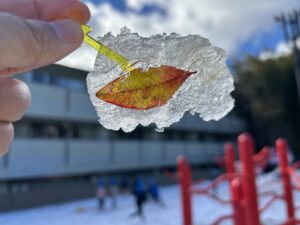 氷は昨日、園庭で先生やお友だちがおもちゃのカップや型にお水や葉っぱなどを入れて作りました☆