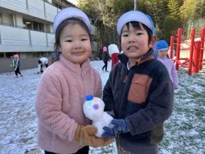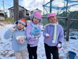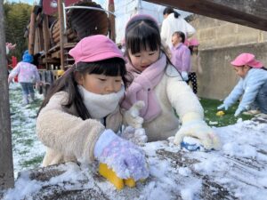昨日の夜から降り始めた雪が積もり、ゆり(年中)組、うめ(年長)組のお友だちは芝生広場で、さくら(年少)組のお友だちは新園庭で、ちゅうりっぷ組(2歳児)のお友だちは園庭で、氷遊びや雪遊びを楽しみました。「雪ふわふわだ!」「雪合戦しよう~!」と大はしゃぎのみんな。雪を集めたり投げ合ったりしながら、冬ならではの遊びに夢中になっていました☆