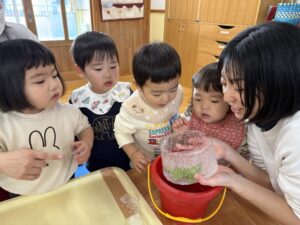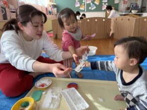 また、たんぽぽ組(0・1歳児)のお友だちはお部屋で氷遊びを楽しみました。