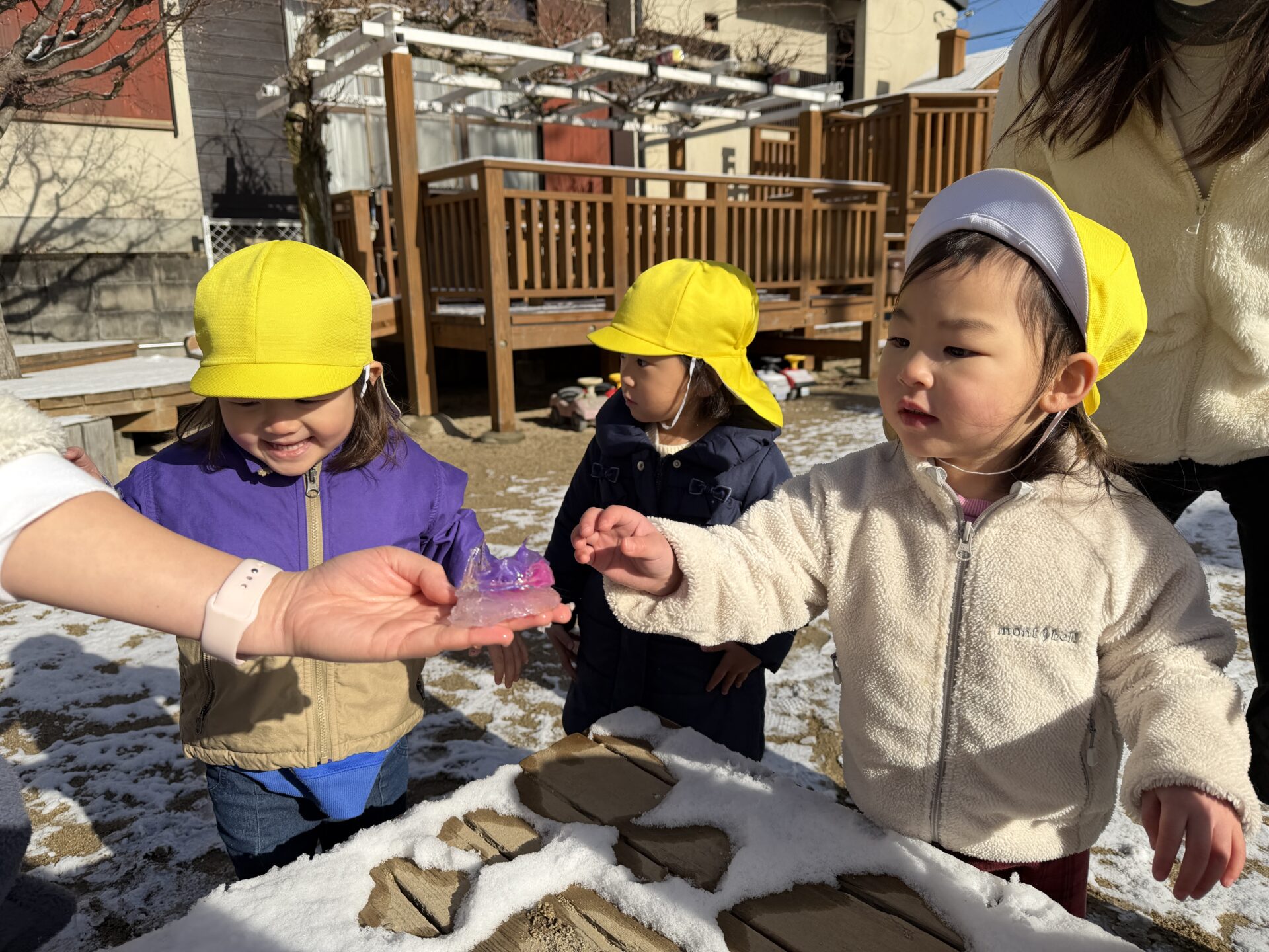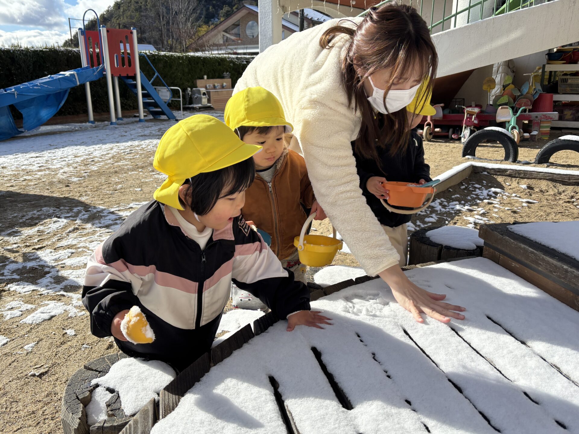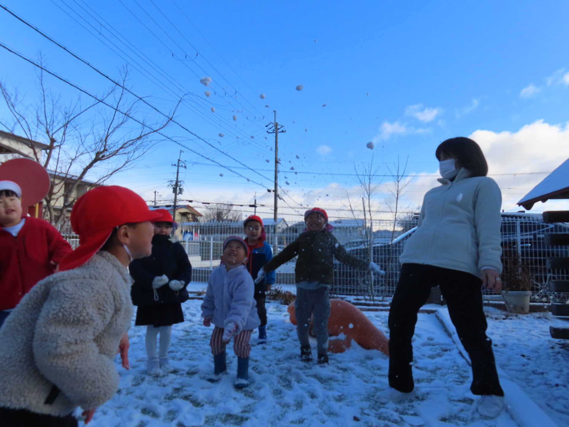 昨日の夜から降り始めた雪が積もり、ゆり(年中)組、うめ(年長)組のお友だちは芝生広場で、さくら(年少)組のお友だちは新園庭で、ちゅうりっぷ組(2歳児)のお友だちは園庭で、氷遊びや雪遊びを楽しみました。「雪ふわふわだ!」「雪合戦しよう~!」と大はしゃぎのみんな。雪を集めたり投げ合ったりしながら、冬ならではの遊びに夢中になっていました☆