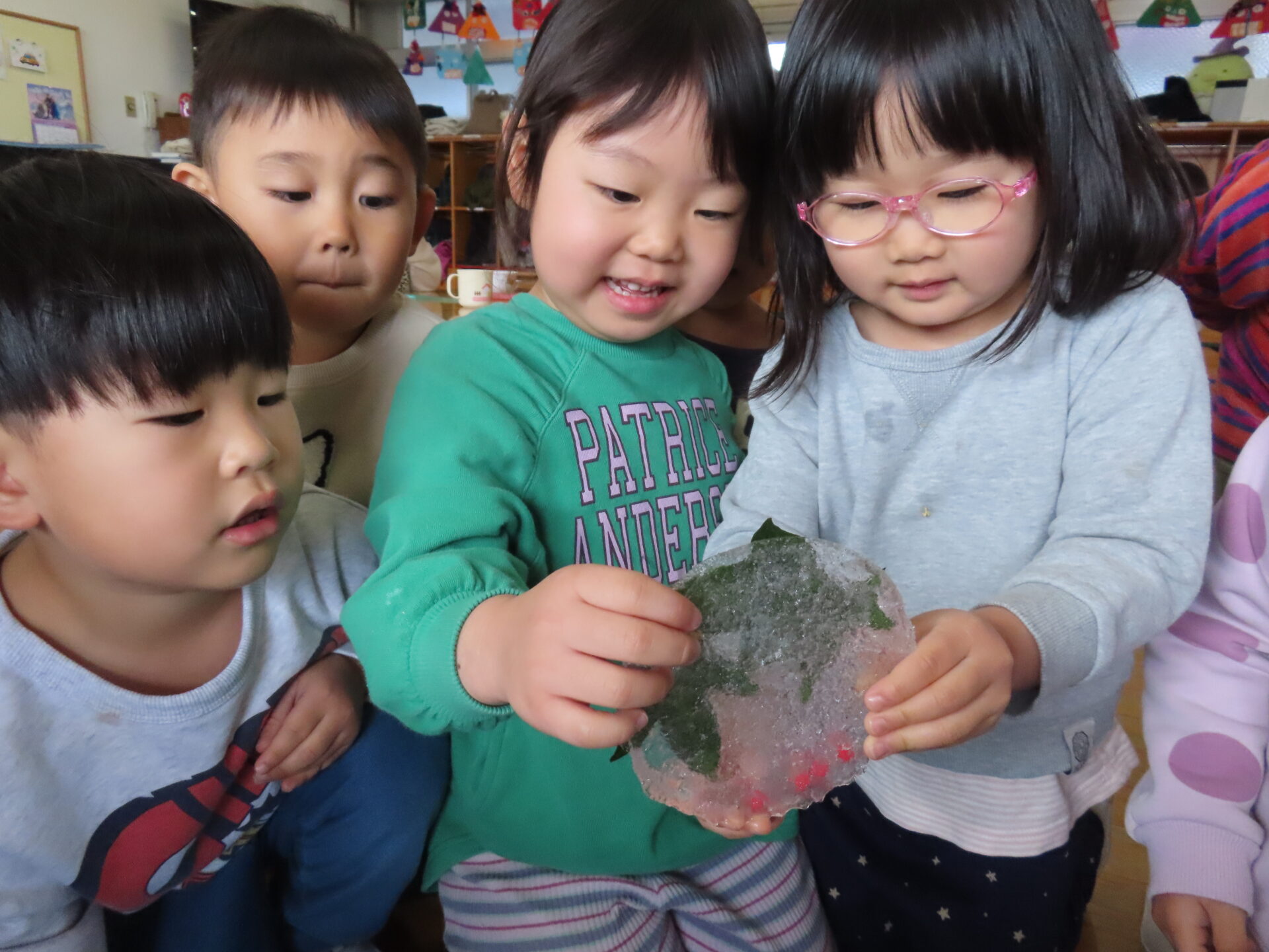 また、たんぽぽ組(0・1歳児)のお友だちはお部屋で氷遊びを楽しみました。