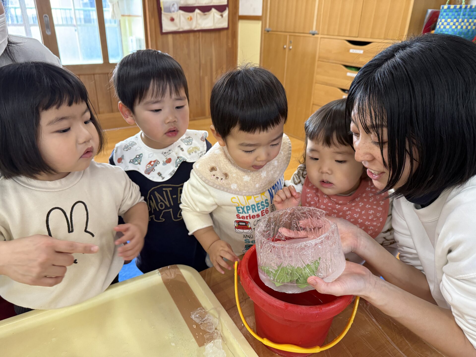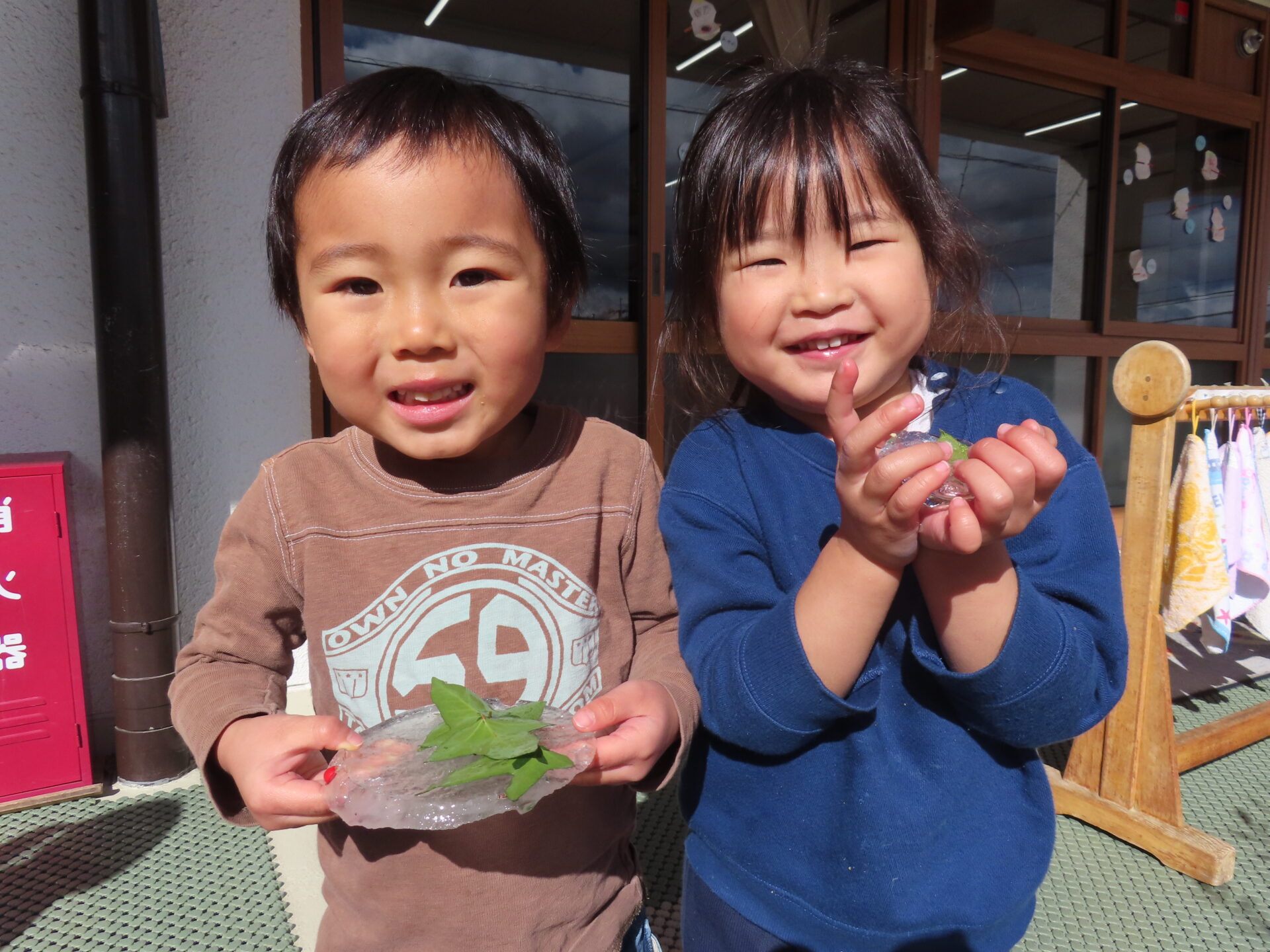 氷は昨日、園庭で先生やお友だちがおもちゃのカップや型にお水や葉っぱなどを入れて作りました☆