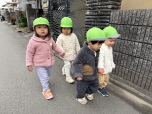 たんぽぽ2組(1歳児)のお友だちは、手を繋いで歩く練習をしています。初めは立ち止まったり、手を離そうとする姿もありましたが、一人ひとりのペースを大切にしながら取り組み、少しずつお友だちと手を繋いで歩ける時間が増えてきました。