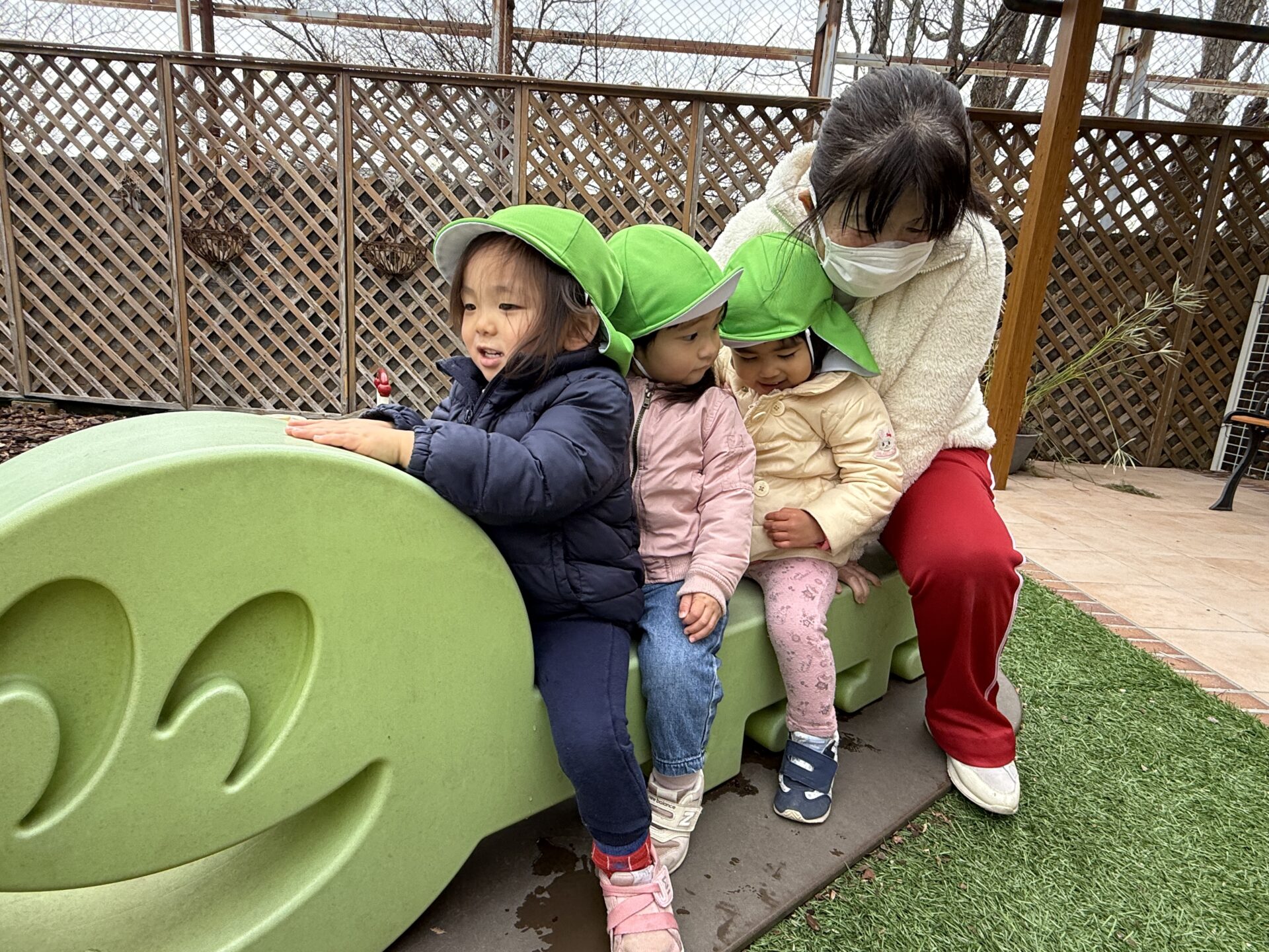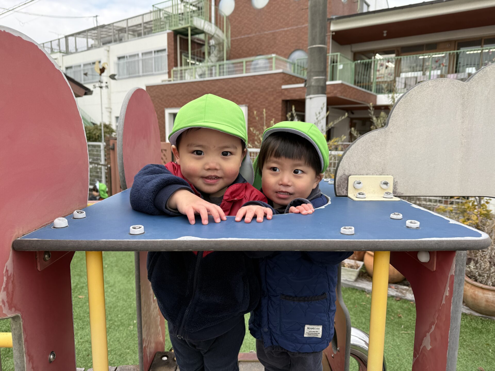 新園庭では、遊具に乗ったり、汽車の遊具から「ばあ!」と顔を出したりして、元気いっぱい遊んでいました。