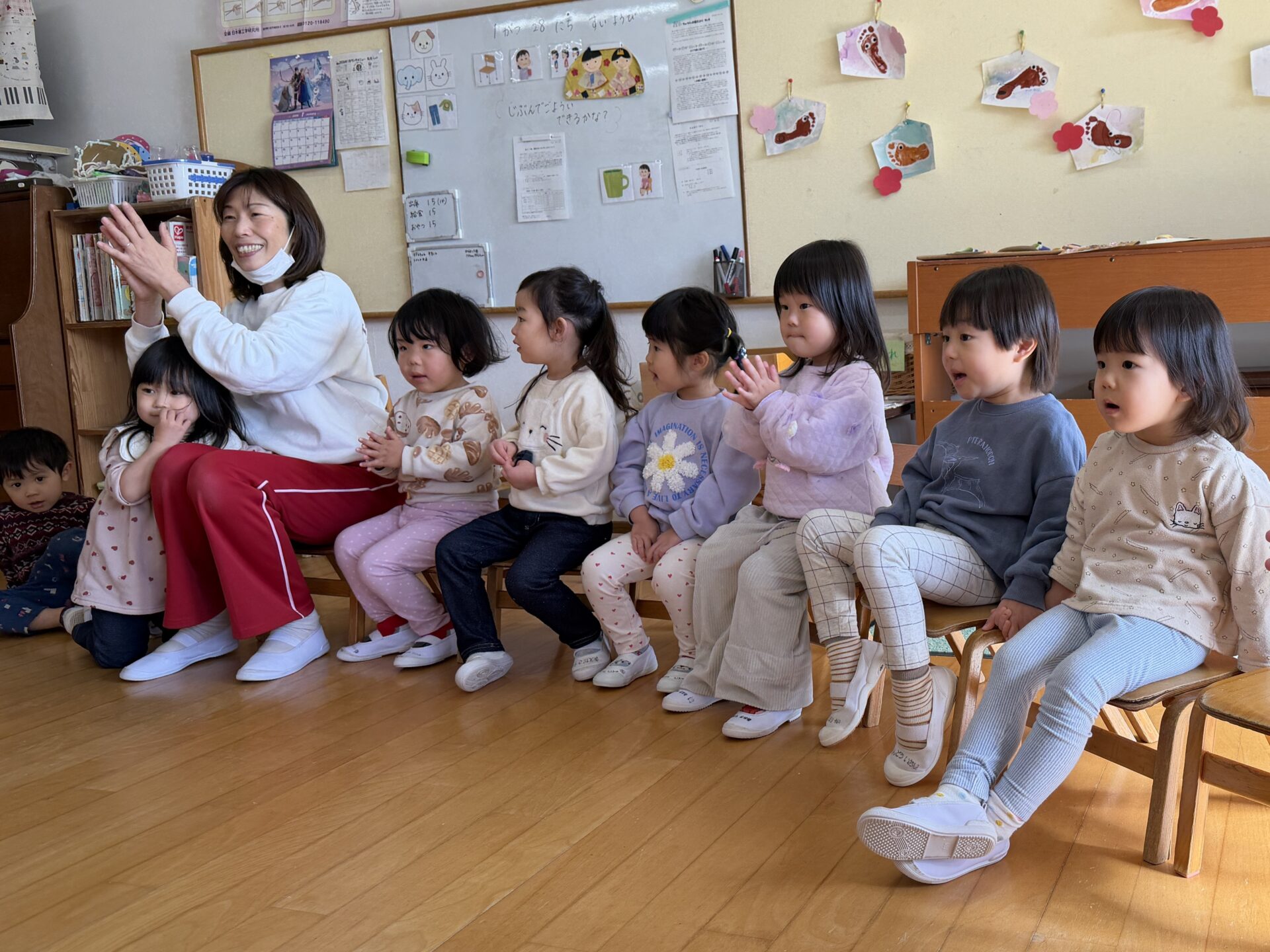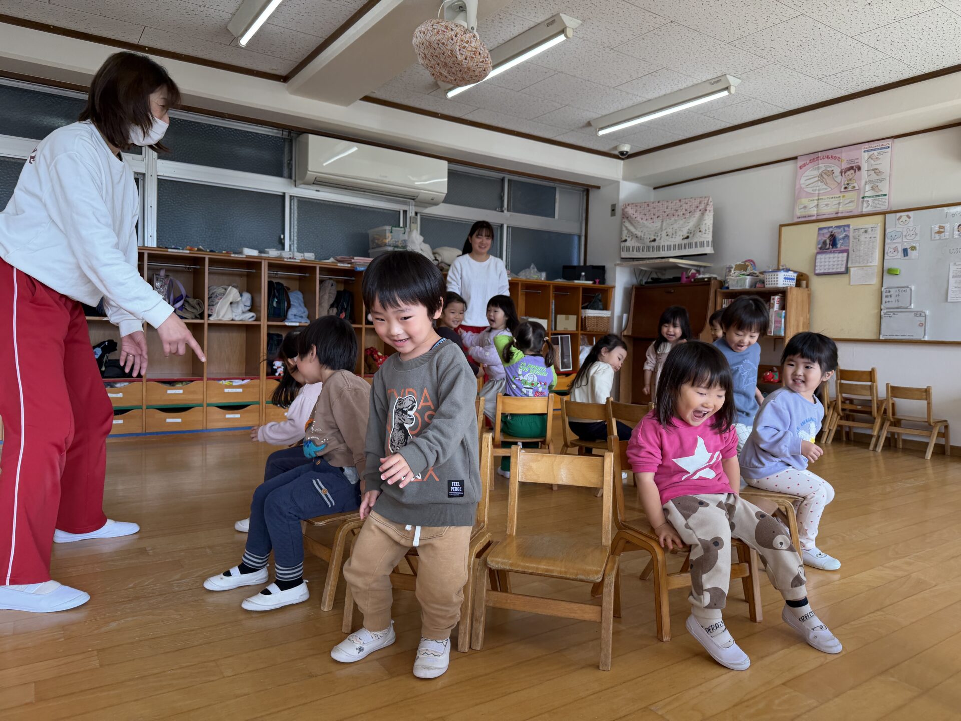 ちゅうりっぷ組(2歳児)のお友だちが、椅子取りゲームをしました。音楽が流れると、円に並べた椅子の周りを音楽に合わせてノリノリで歩く子どもたち。音楽が止まると、「ここかな?」と空いている椅子を見つけて急いで座っていました。椅子に座れると「やった~!」と大喜びしたり、座れなかったお友だちも「がんばれ~!」と応援したりする姿が見られました。最後まで残ったお友だちは、みんなから「おめでとう!」と言ってもらって嬉しそうにしていました☆