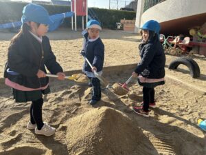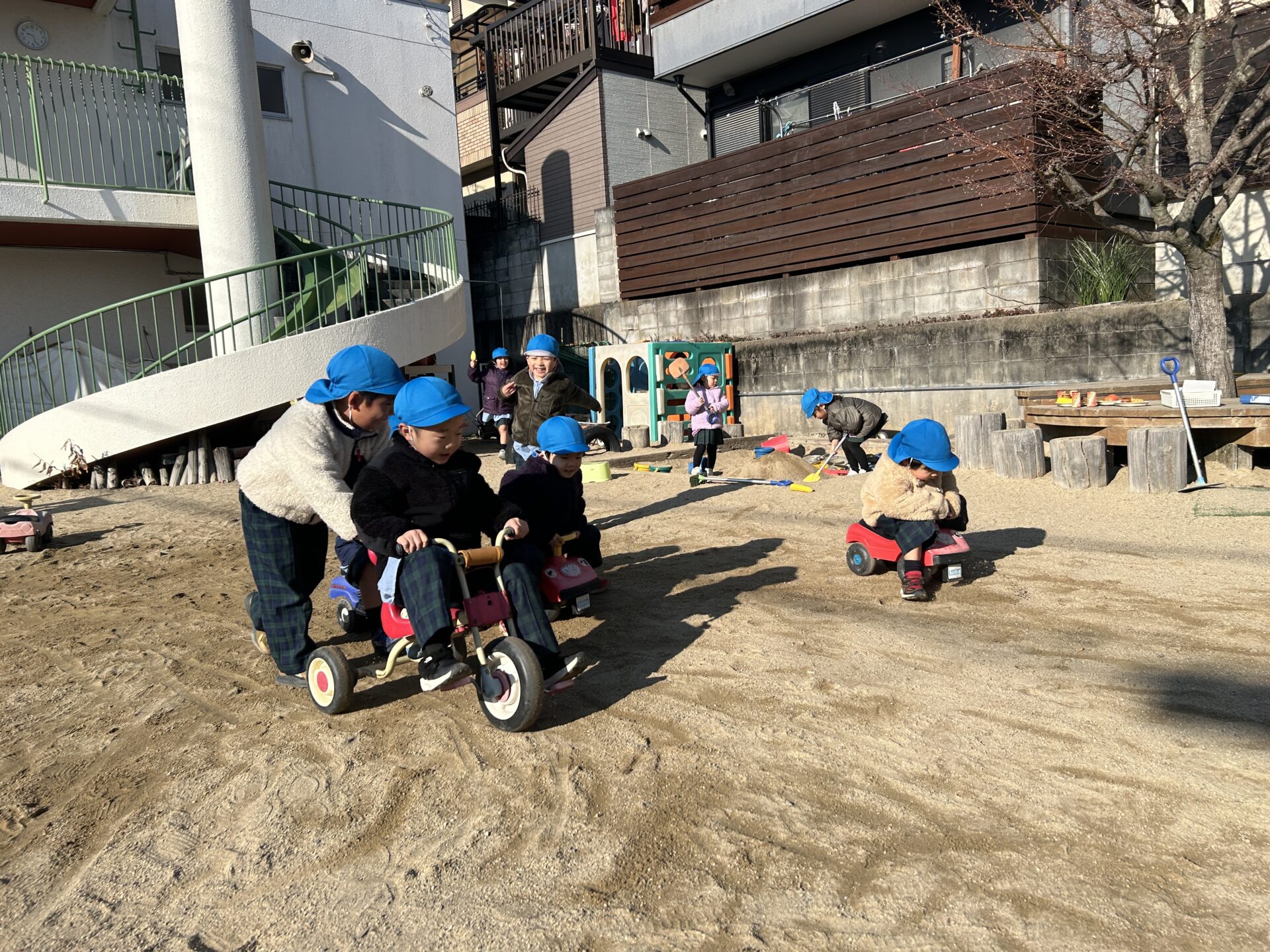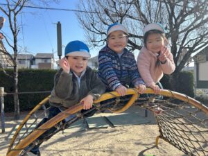 ゆり(年中)組のお友だちが園庭で遊びました。車のおもちゃに乗ってレースをしたり、ウッドデッキでは「いらっしゃいませ〜♪」とレストランごっこを楽しんだりしていたみんな☆また、お友だちと力を合わせて大きな砂山を作ったり、太鼓橋の上から「やっほー!」と手を振ったりと、寒さに負けず元気いっぱい体を動かして遊んでいました♪