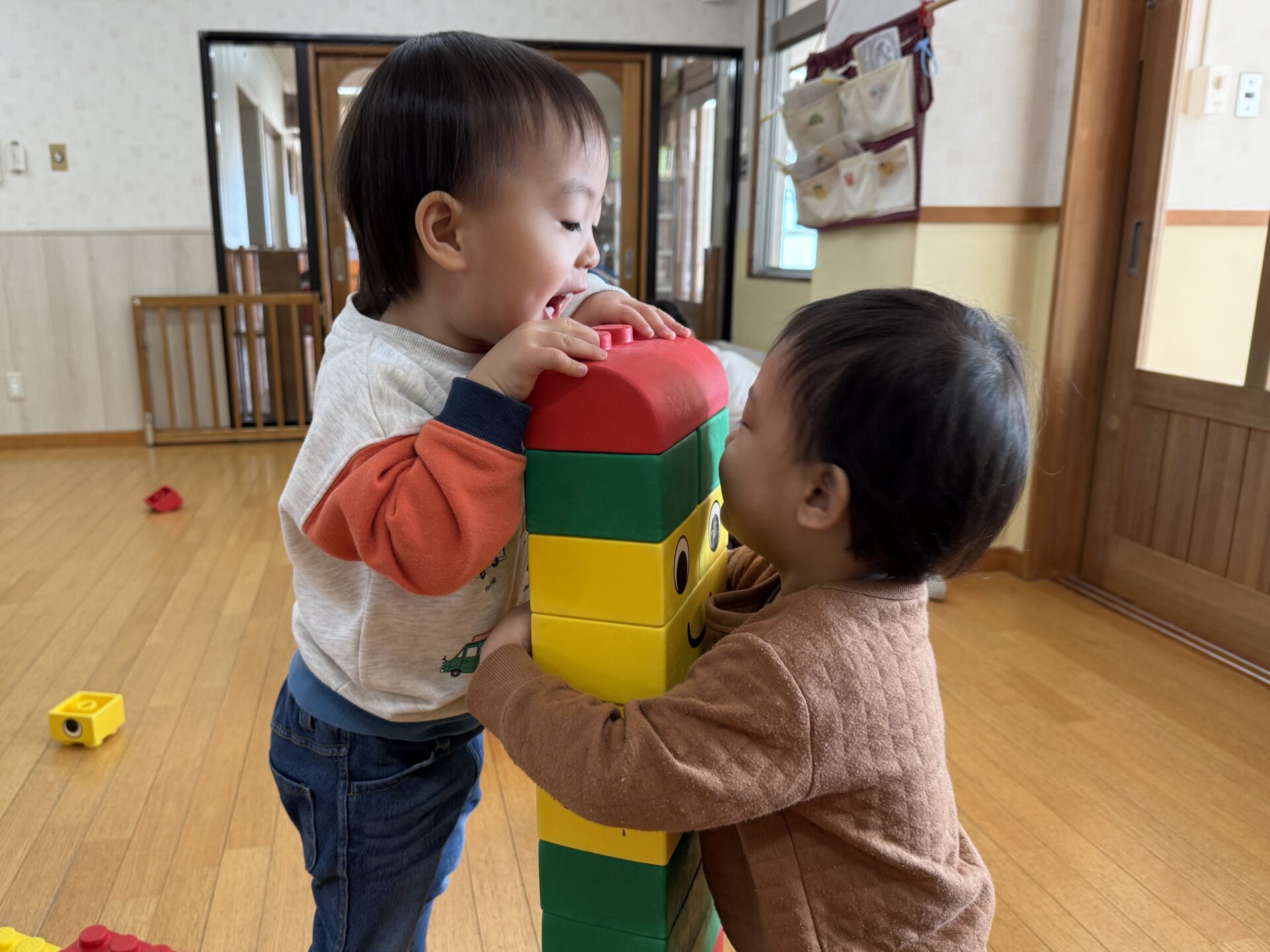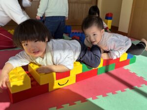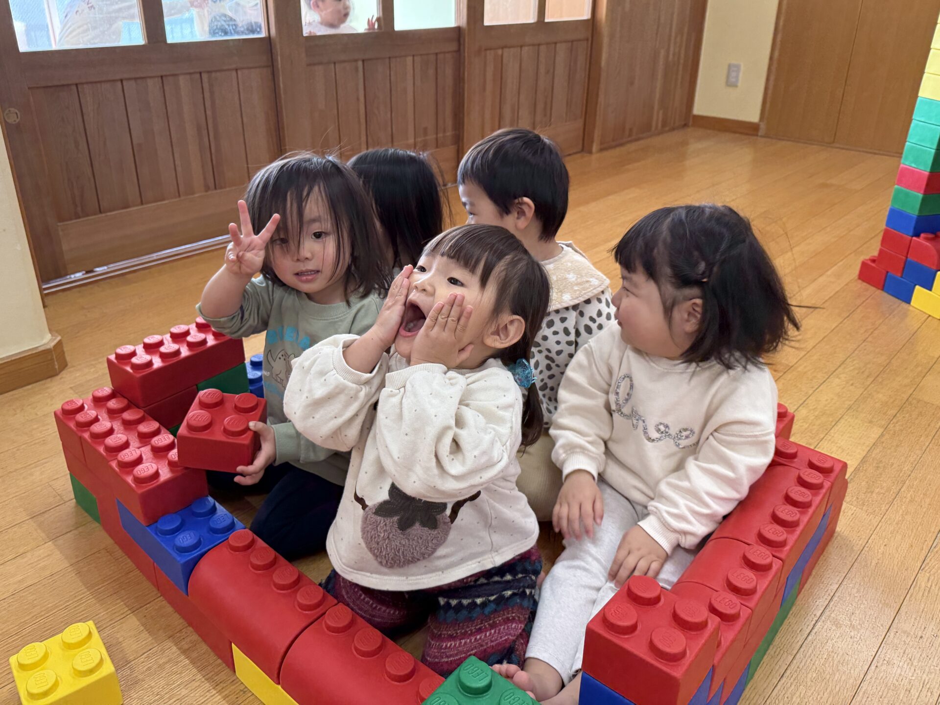 たんぽぽ2組(1歳児)のお友だちが、大型レゴブロックで遊びました。ブロックを高く積み上げたり、大きな囲いを作ったりして遊んでいたみんな☆囲いの中に入ると、お風呂に入っているように背中を洗い合ったり、顔を洗うまねをしたりしてごっこ遊びを楽しんでいました☆お友だちと一緒に、夢中になって遊んでいた子どもたちです♪