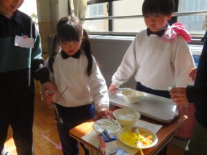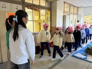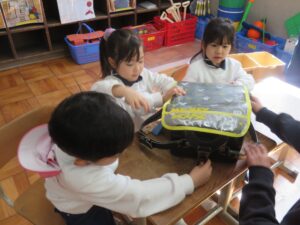 鷹峯小学校の6年生が、4月から1年生になるうめ(年長)組のお友だちに小学校を知ってもらい、期待を持ってもらえるようにと、お楽しみ会を開いてくれました。到着すると、お兄さん・お姉さんがお出迎え♪『給食当番のお仕事(エプロンを付けたり、給食を運ぶ)』『掃除の仕方』『ひらがなクイズ』『ゲームコーナー』などの9ブースに分かれて、小学校について教えてもらいました。初めは少し緊張しているお友だちもいましたが、実際に給食エプロンや帽子をつけてみたり、ひらがなや数字を教えてもらったりして、笑顔で楽しんでいましたよ☆