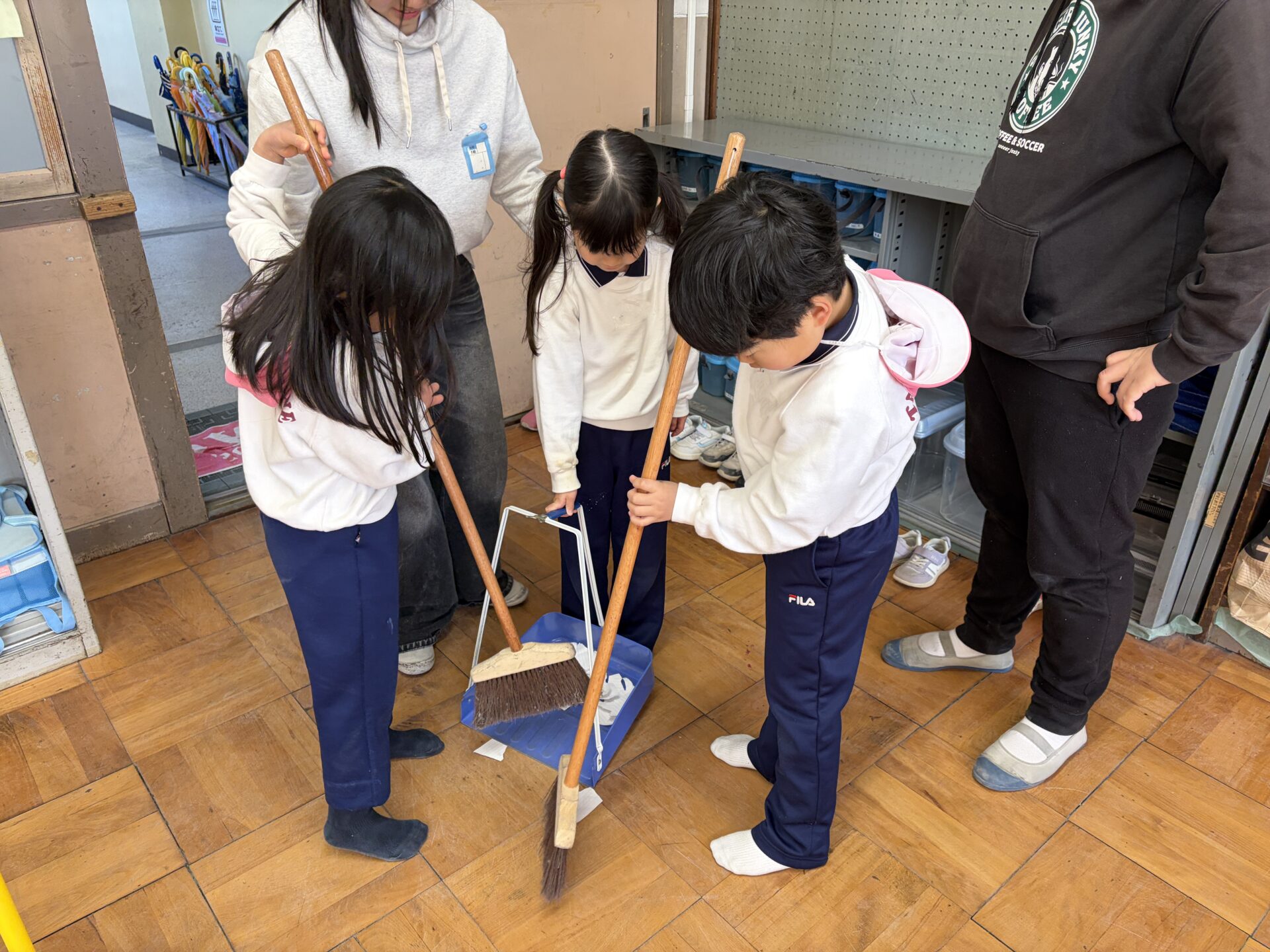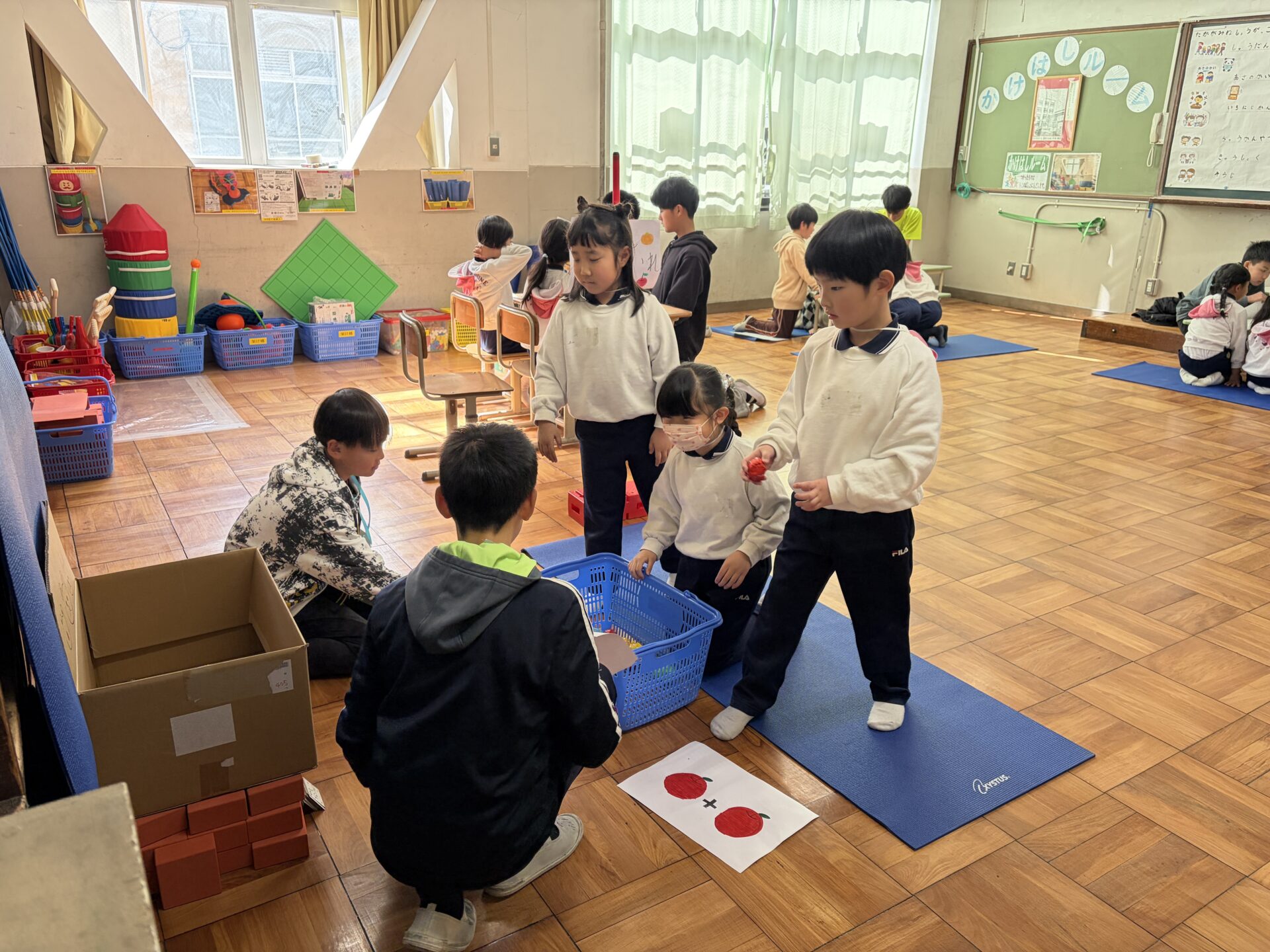 鷹峯小学校の6年生が、4月から1年生になるうめ(年長)組のお友だちに小学校を知ってもらい、期待を持ってもらえるようにと、お楽しみ会を開いてくれました。到着すると、お兄さん・お姉さんがお出迎え♪『給食当番のお仕事(エプロンを付けたり、給食を運ぶ)』『掃除の仕方』『ひらがなクイズ』『ゲームコーナー』などの9ブースに分かれて、小学校について教えてもらいました。初めは少し緊張しているお友だちもいましたが、実際に給食エプロンや帽子をつけてみたり、ひらがなや数字を教えてもらったりして、笑顔で楽しんでいましたよ☆