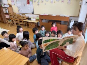 ※『ものがたりメニュー』とは、絵本をテーマにした献立のことで、給食の先生が毎月食育活動の一環として作ってくださります。お鍋の中をのぞいたり、どんな食材が使われているのかを知ったりすることで食べることへの興味・関心が育まれます。