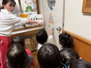 ちゅうりっぷ組(2歳児)のお友だちは、絵本を読んだ後、給食室前に貼ってあるはらぺこあおむしや食べ物を見に行きました。