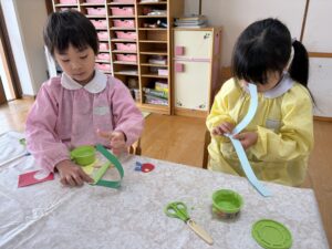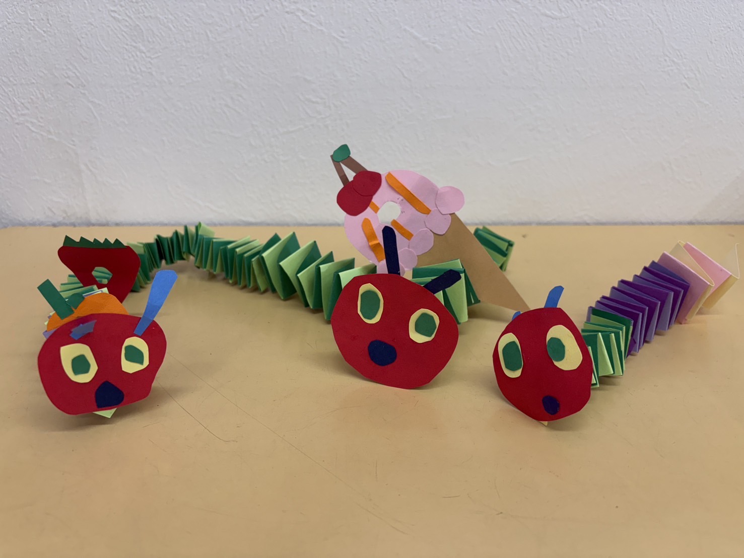 うめ(年長)組のお友だちは、画用紙を使ってあおむし制作。細長い紙2本を交互に折って体を作ったり、絵本に出てくるアイスやりんごを丁寧に作ったりと工夫する姿が見られました。おやつの時間には、机に並べて「あおむしさん、どうぞ♪」と一緒に食べていました☆