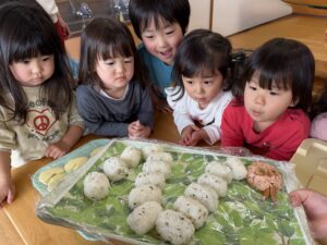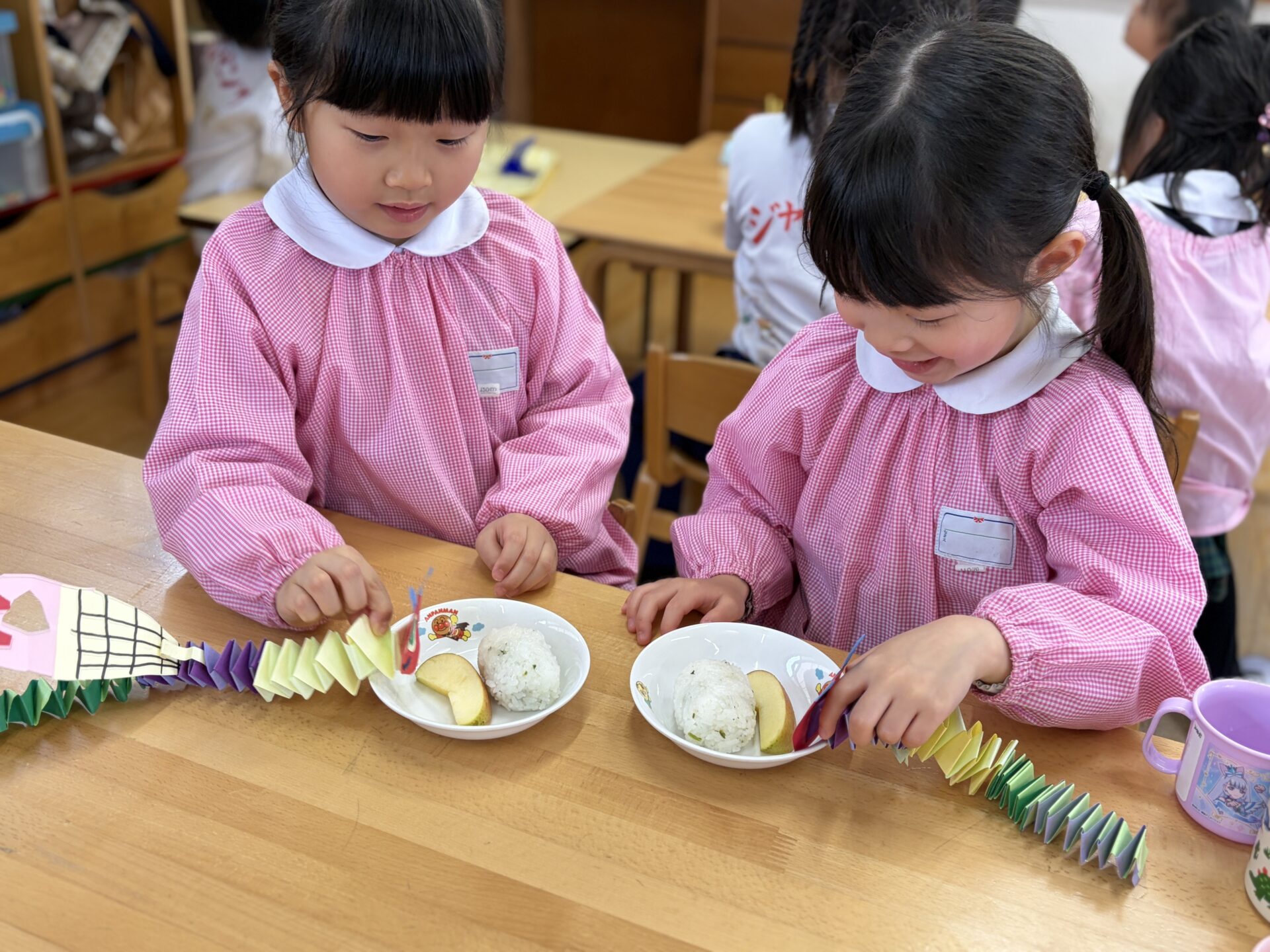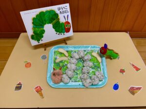 今日のおやつは『ものがたりメニュー“はらぺこあおむし”』(作/絵:エリック・カール)にちなんだ“あおむしおにぎり”でした。