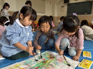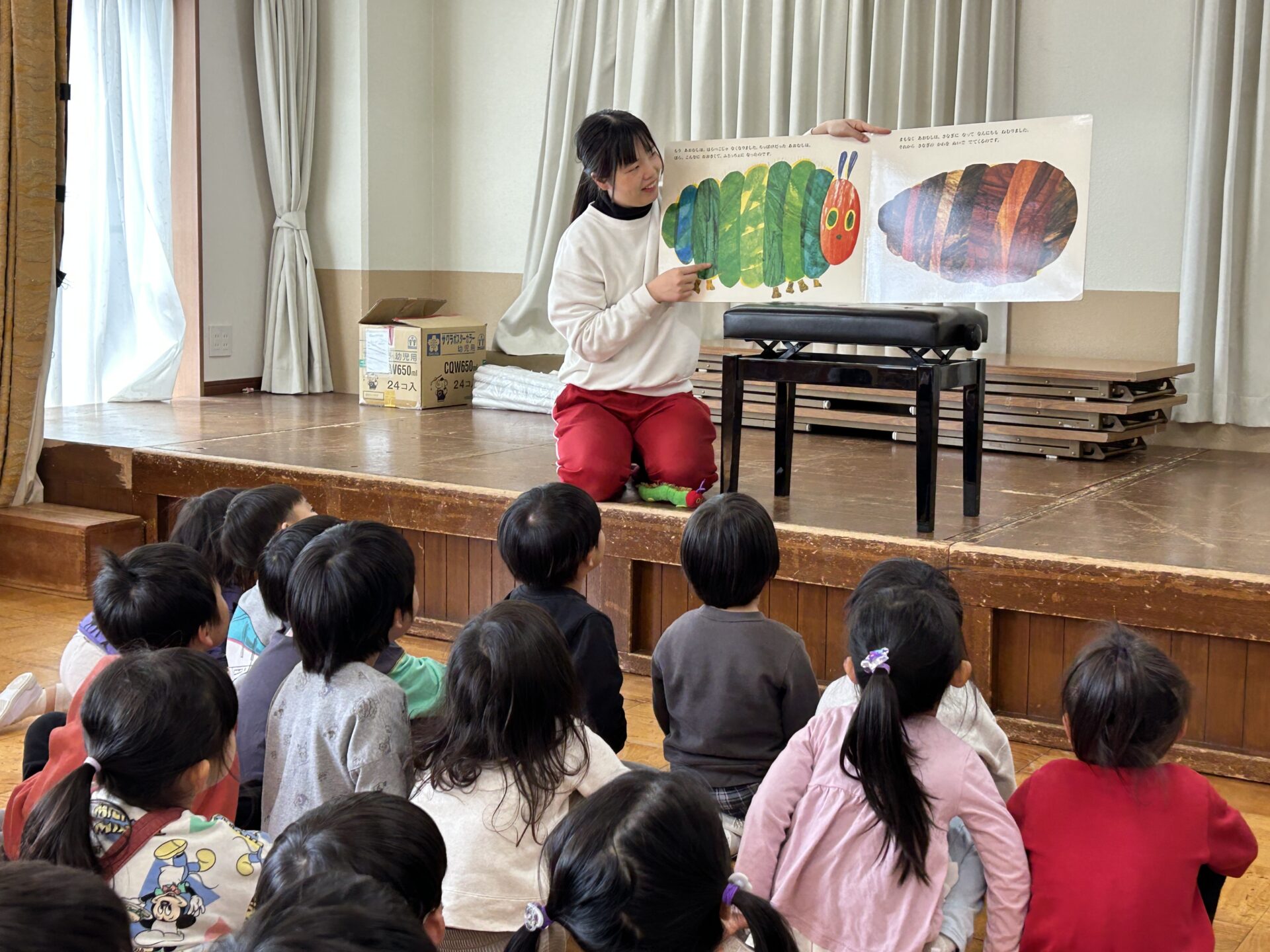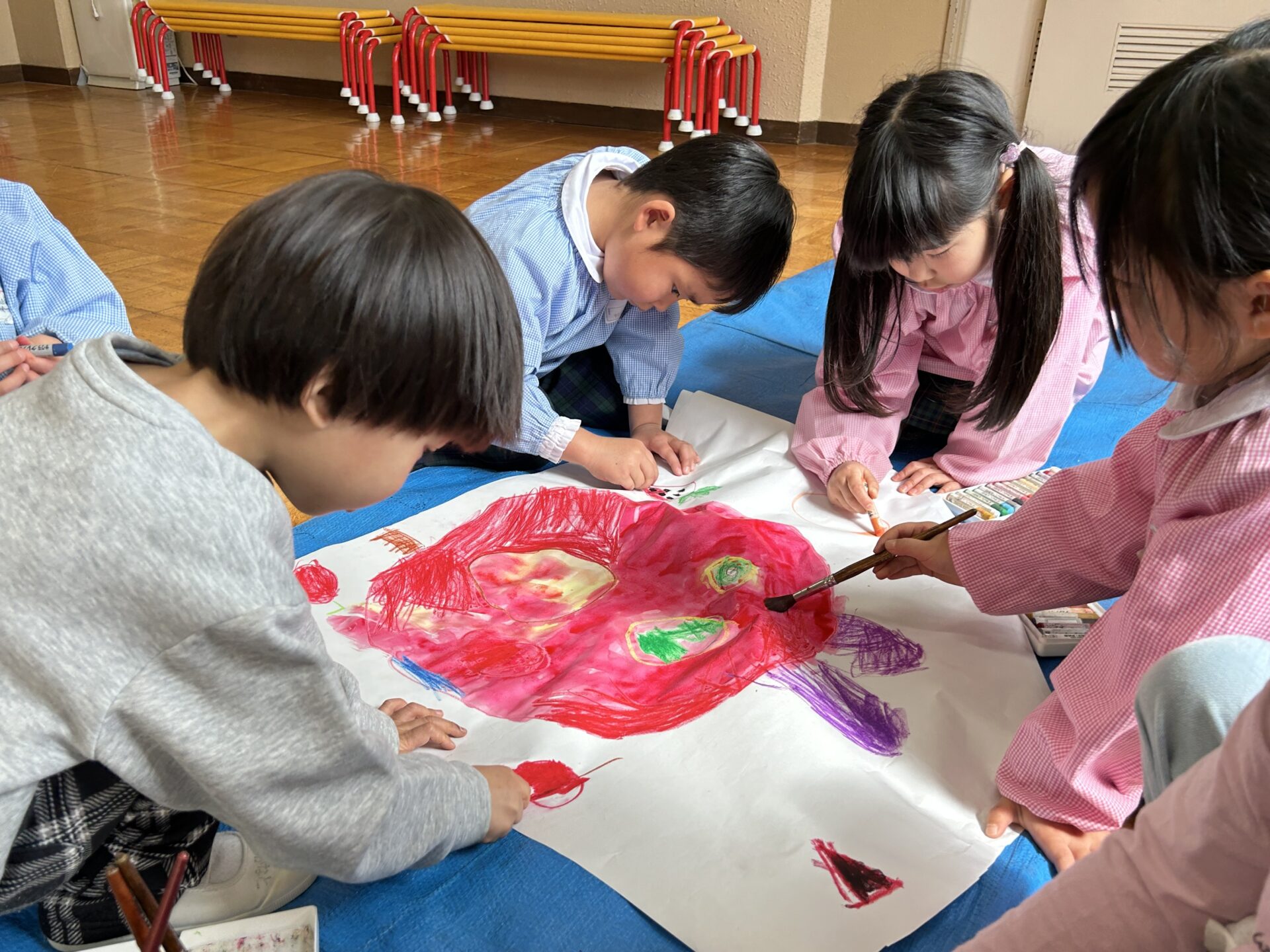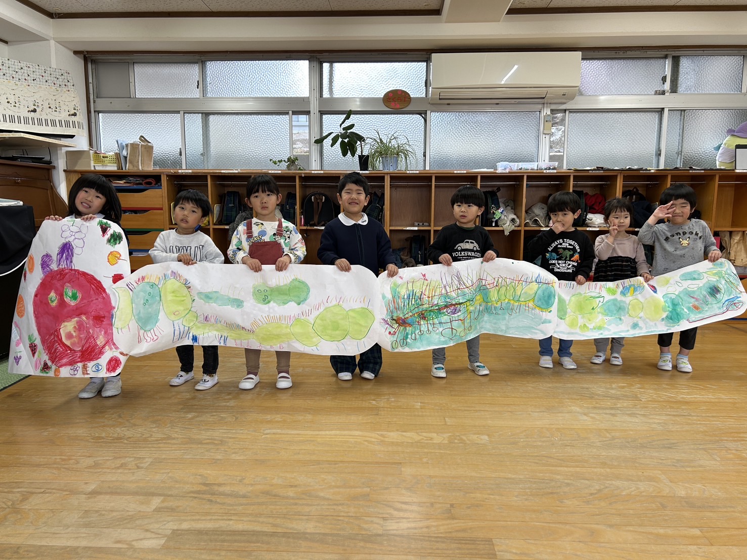 さくら(年少)組とゆり(年中)組のお友だちは、ホールに集まって大型絵本を楽しんだ後、お絵描きをしました。あおむしの顔と体を描くグループに分かれて「大きなあおむしにしよう♪」「カラフルな毛にするのもいいね!」と相談しながら描き進めていた子どもたち☆紙をつなげると、“巨大あおむし”が完成!みんなでたくさんお話ししながら、楽しいひとときを過ごしました♪