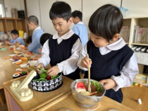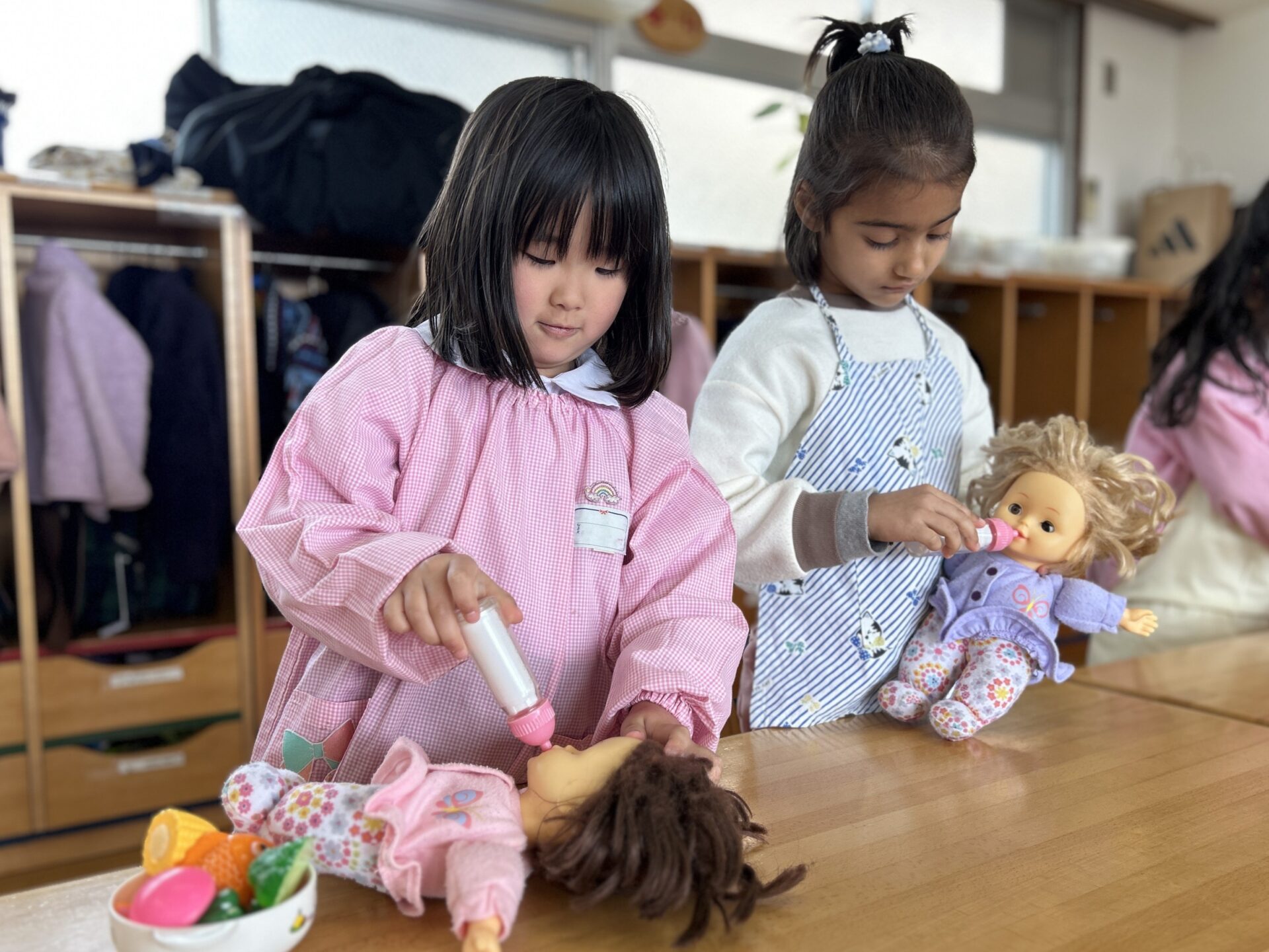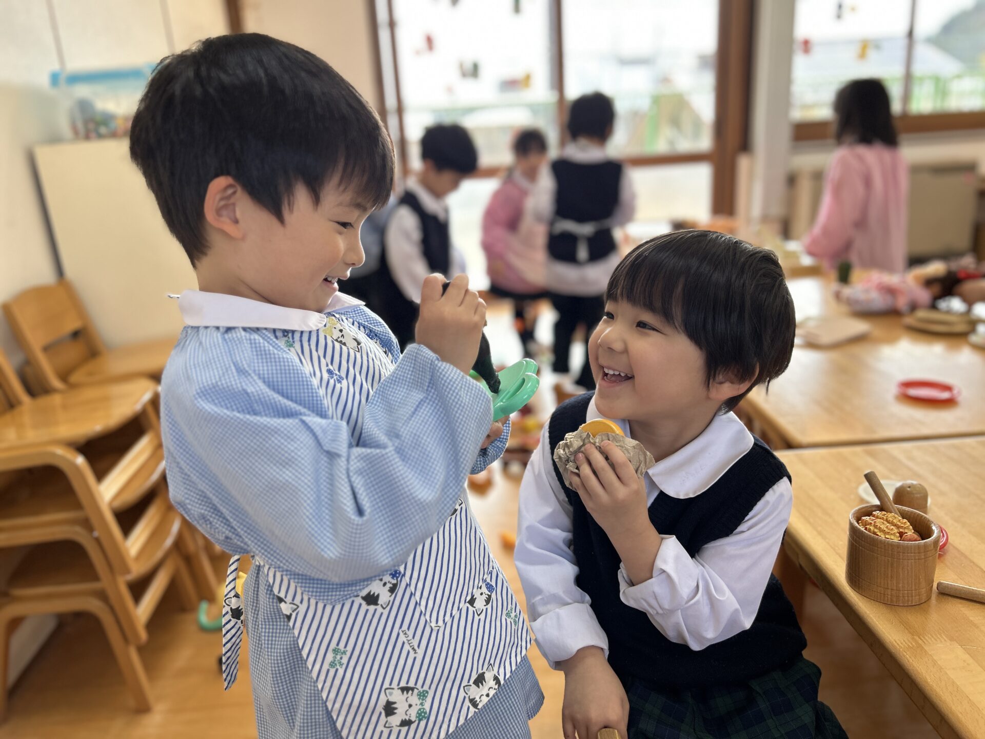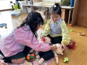 ゆり(年中)組のお友だちが、おままごとを楽しみました♪赤ちゃんのお人形に「おいしいよ~!」とミルクやご飯をあげたり、キッチンに立ってお野菜を洗ってジュージュー炒めたり…☆また、「ご注文は?」「ハンバーガーください!」などと、店員さんになりきって遊ぶお友だちもいました♪