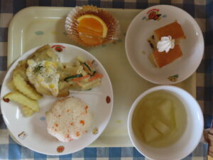 2026.03.10 給食 3月10日 ☆お誕生会メニュー☆ 人参ごはん フィッシュアンドチップス マカロニサラダ 清美オレンジ じゃが芋と玉ねぎのスープ レーズンケーキ 牛乳 < 前へ 次へ > お知らせ・ブログ一覧へ