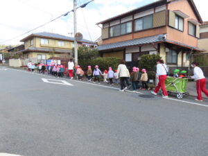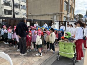 その後、広域避難場所である鷹峯小学校まで歩いて移動しました。先生のお話をよく聞きながら、子どもたちは真剣な表情で訓練に取り組んでいました。