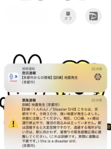 京都市では、午前9時35分に大地震が発生したという想定で、シェイクアウト訓練(一斉防災行動訓練)が実施されました。子どもたちは机の下に入り、ダンゴムシのポーズ(正座をして太ももとおなかをくっつけて丸まる姿勢)をとり、揺れが収まるのを待ちました。