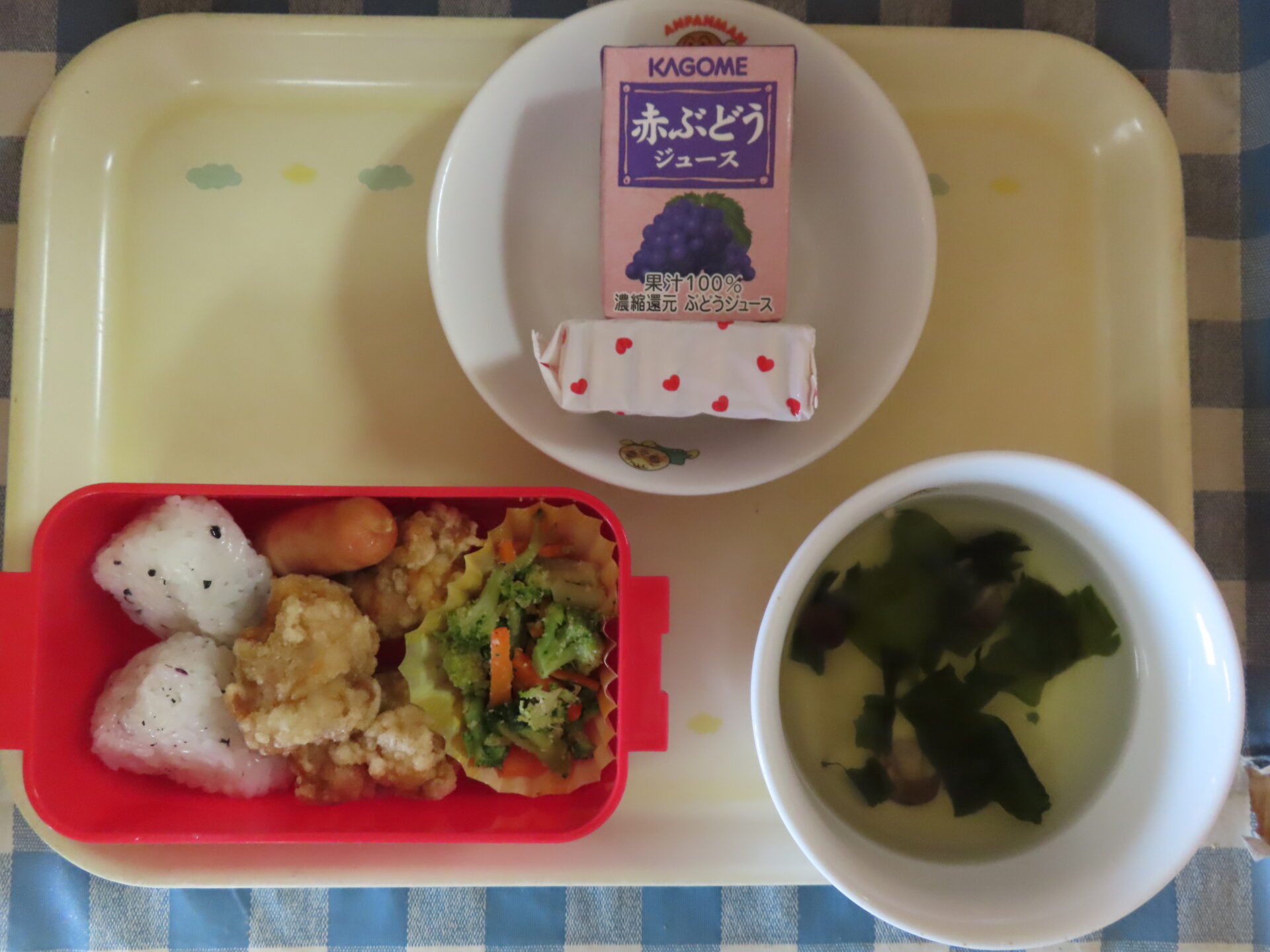 2026.03.11 給食 3月11日 ☆ものがたりメニュー☆ ☆食体験:おべんとうづくり☆ ゆかりおにぎりとごま塩おにぎり 鶏肉の唐揚げ ウインナー・ブロッコリーのごま和え 大根としめじのすまし汁 ビスコ 牛乳 < 前へ 次へ > お知らせ・ブログ一覧へ