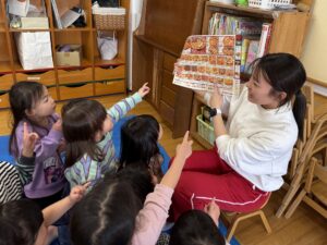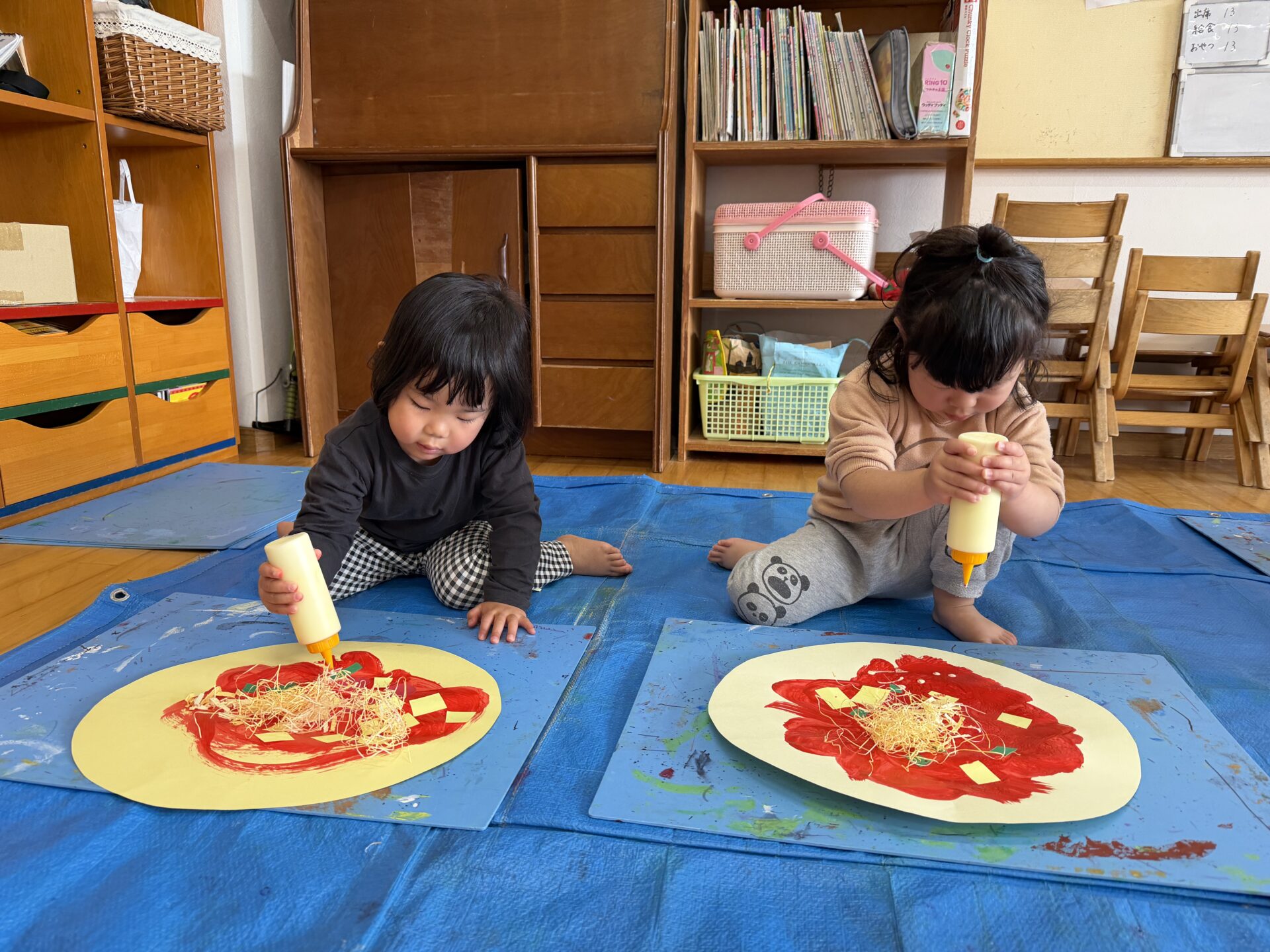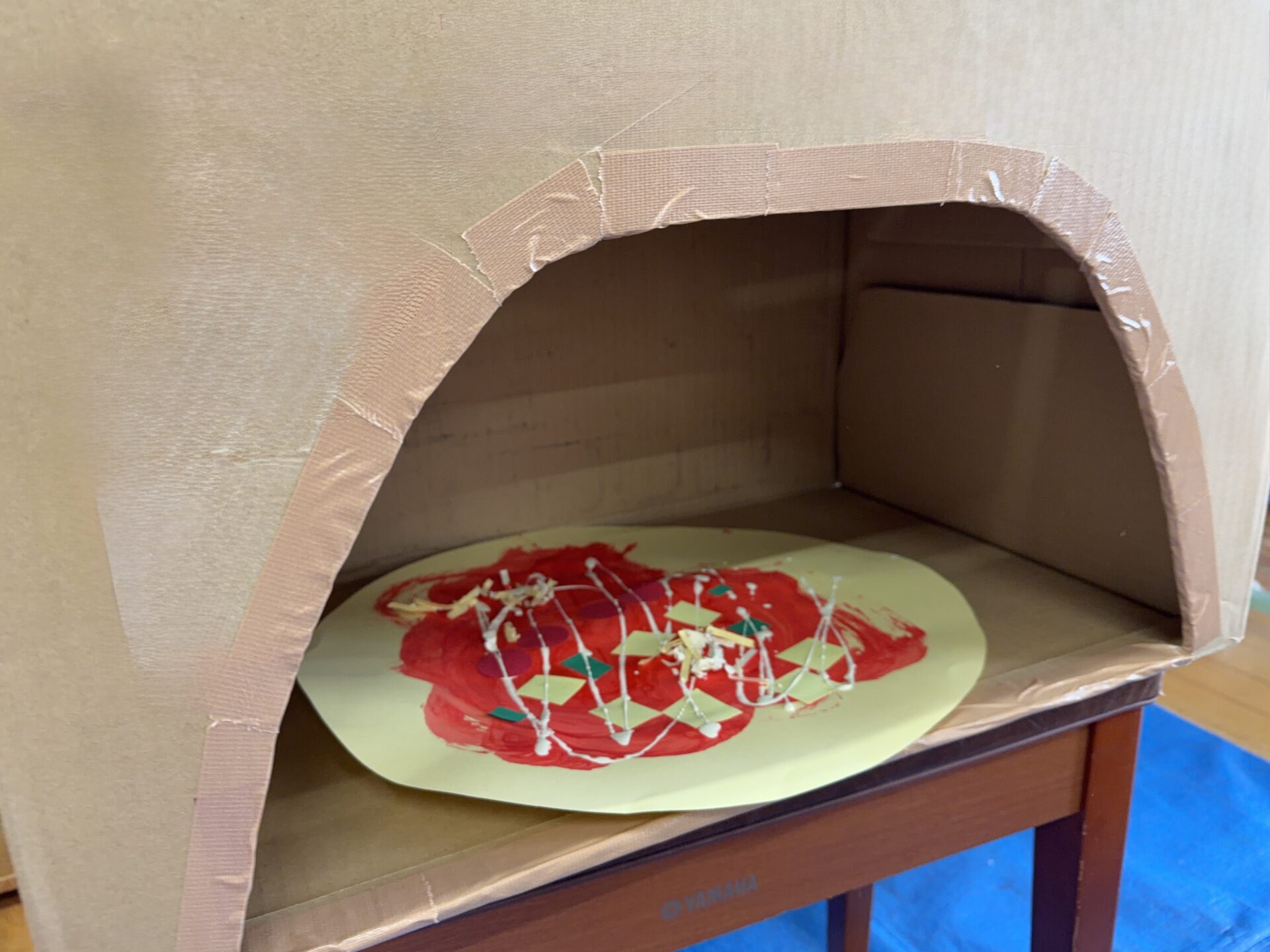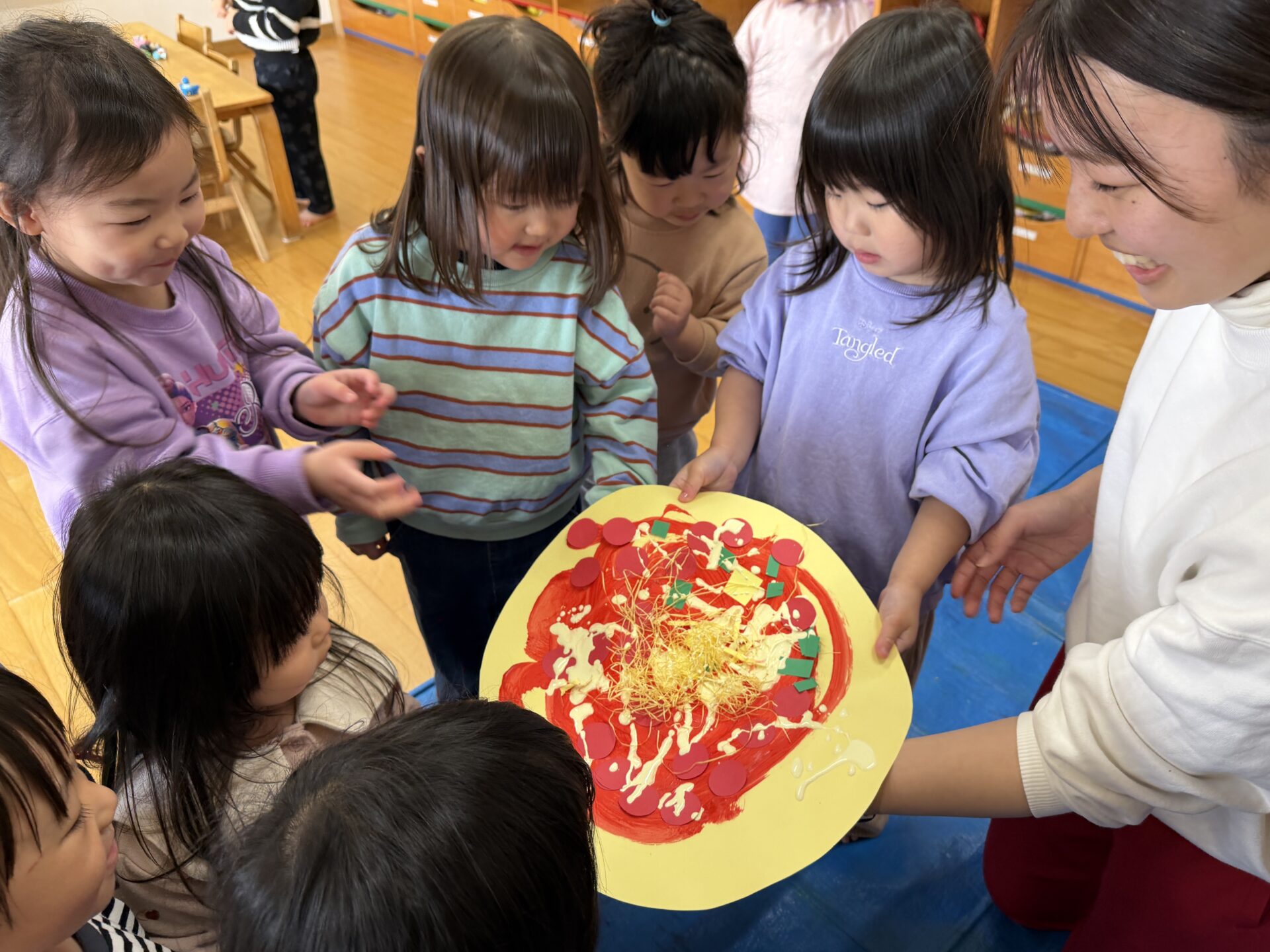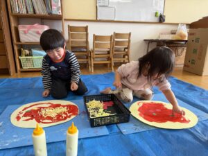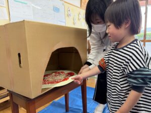 ちゅうりっぷ(2歳児)組のお友だちが、『ピザ』の絵を描きました。まずは画用紙で作ったピザ生地に、赤色の絵の具でピザソースを塗り、その上に画用紙で作ったトマトやピーマン、チーズなどの具材をのせます。さらにクリーム色の絵の具でクリームソースをかけ、段ボールで作ったピザ窯に入れて焼き上げました。「いい匂いしてきた~!」「あちちちち!」と、まるで本物のピザを焼いているかのように楽しむ子どもたち。焼き上がると嬉しそうに窯から取り出し、「見て見て!」とお友だちに見せ合う姿が見られました☆