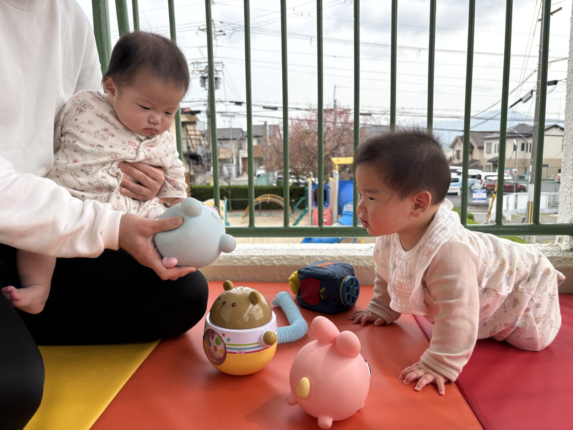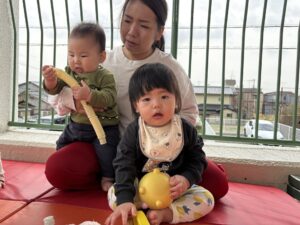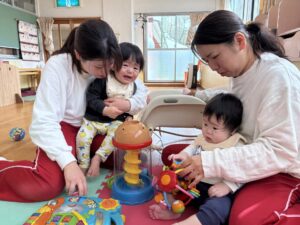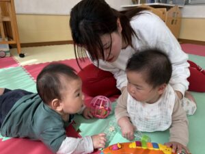 2026.04.06 園日記 おもちゃで遊ぶと楽しいね♪ たんぽぽ1組(0歳児)のお友だちは、お母さんと離れるのが悲しくて涙を見せる姿も見られますが、少しずつおもちゃに興味を持ち、先生と一緒に遊ぶ様子も見られてきました☆また、お友だち同士で見つめ合う可愛らしい一面もありました♪ < 前へ 次へ > お知らせ・ブログ一覧へ