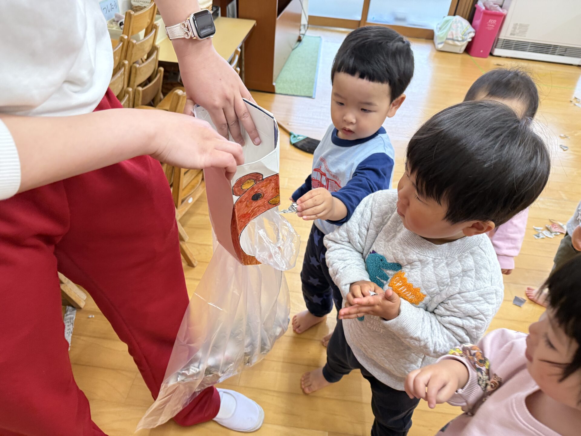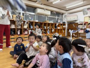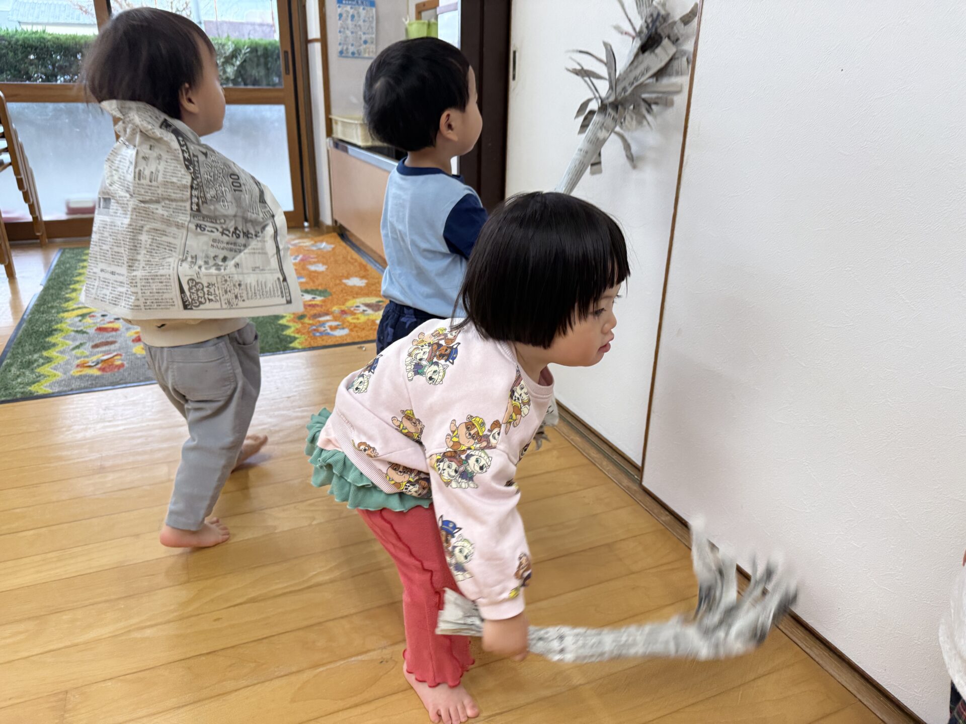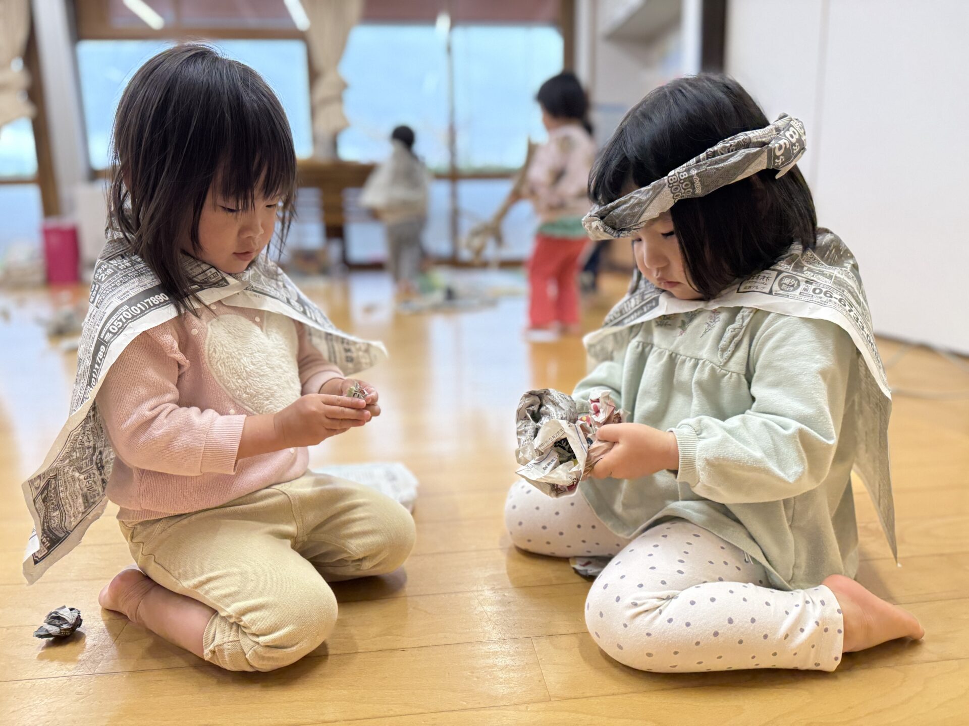 2026.04.07 園日記 新聞紙遊びをしたよ♪ ちゅうりっぷ組(2歳児)のお友だちが、新聞紙遊びをしました。マントや帽子を作ったり、ほうきにしてお掃除ごっこをしたりして楽しんでいました。また、破った新聞紙を上から降らせると、「雨みたい!」「もう一回!」と大喜びでした☆ < 前へ 次へ > お知らせ・ブログ一覧へ