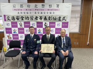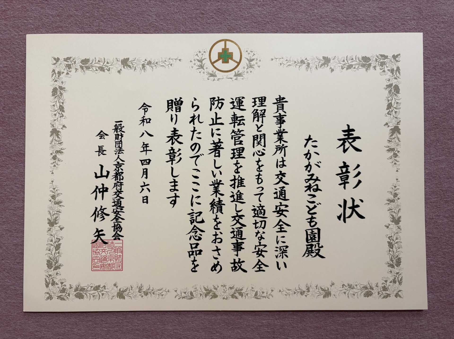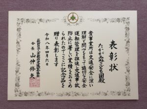 2026.04.07 園日記 交通安全の表彰を受けました 本日、当園は、日頃より安全運転管理を推進し、交通事故防止に努めてきたことが認められ、京都府交通安全協会より表彰を受けました。 今後も引き続き交通安全への意識を高く持ち、園バス等の安全運行に努めてまいります。 < 前へ お知らせ・ブログ一覧へ