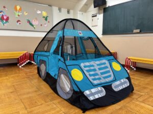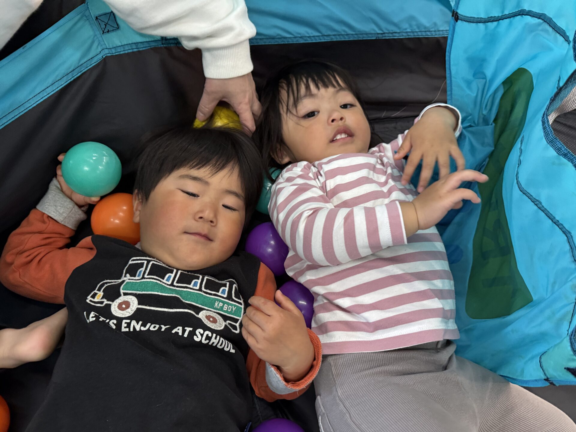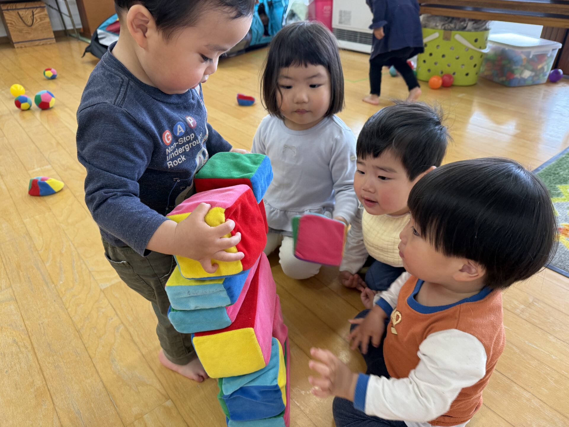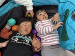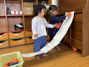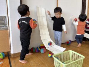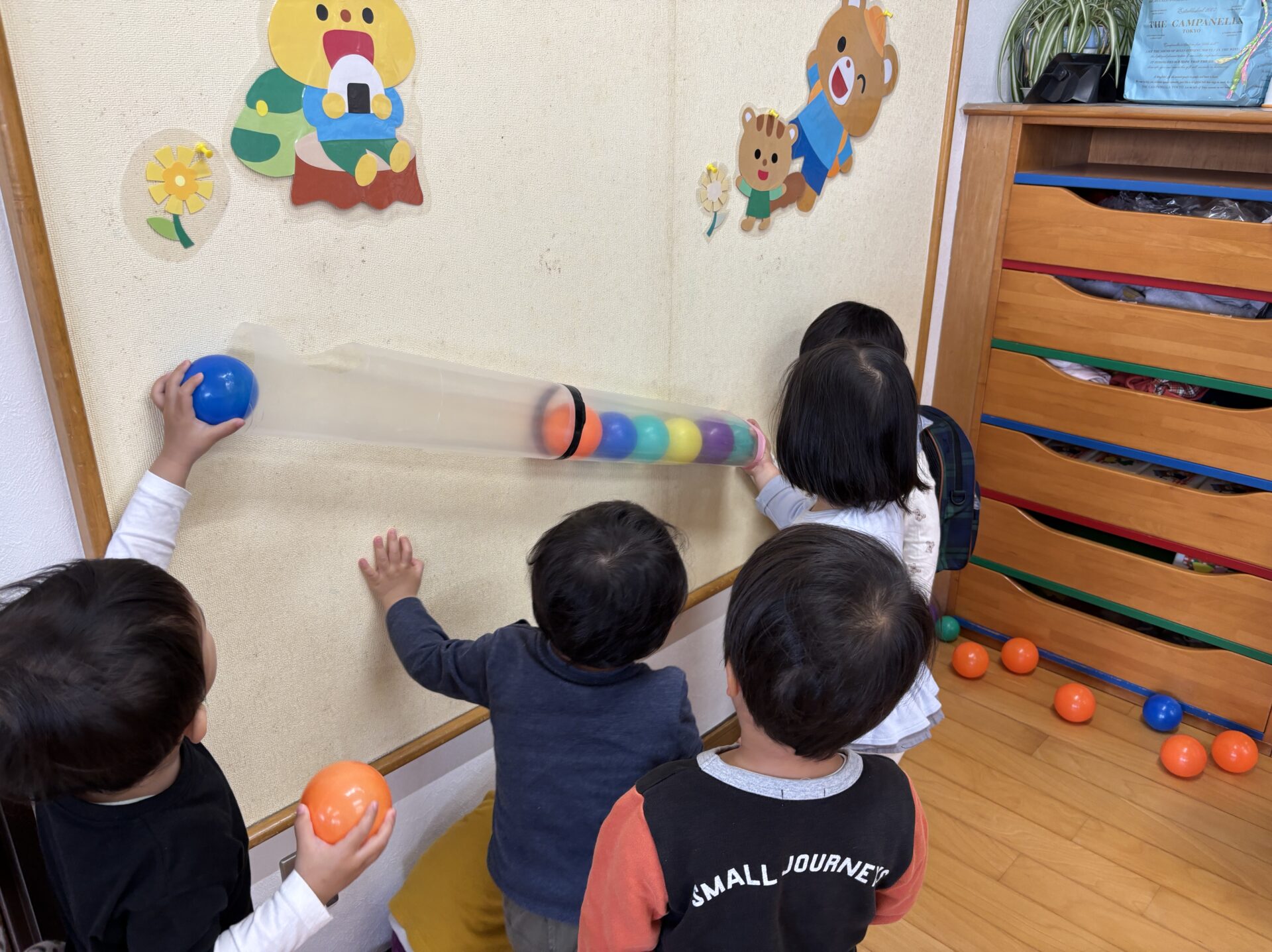 ちゅうりっぷ組(2歳児)のお友だちが、ボール遊びをしました。車の形をしたテントにボールを入れたり、透明の筒にコロコロと転がしていたみんな♪また、牛乳パックで作ったスロープにボールを転がして、カゴに入ると「やった~入った!」と夢中になって楽しんでいました!