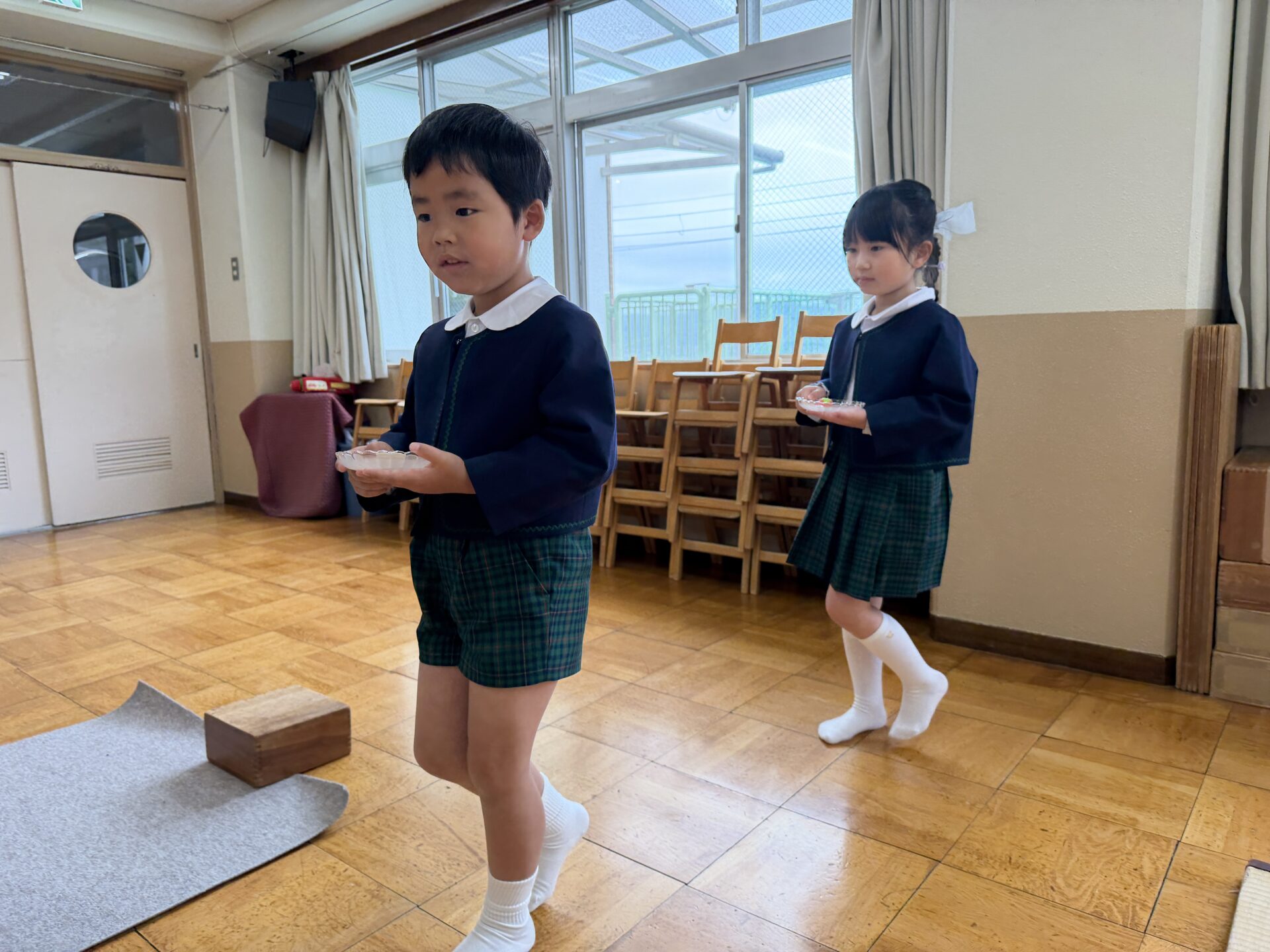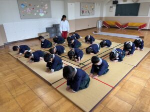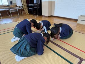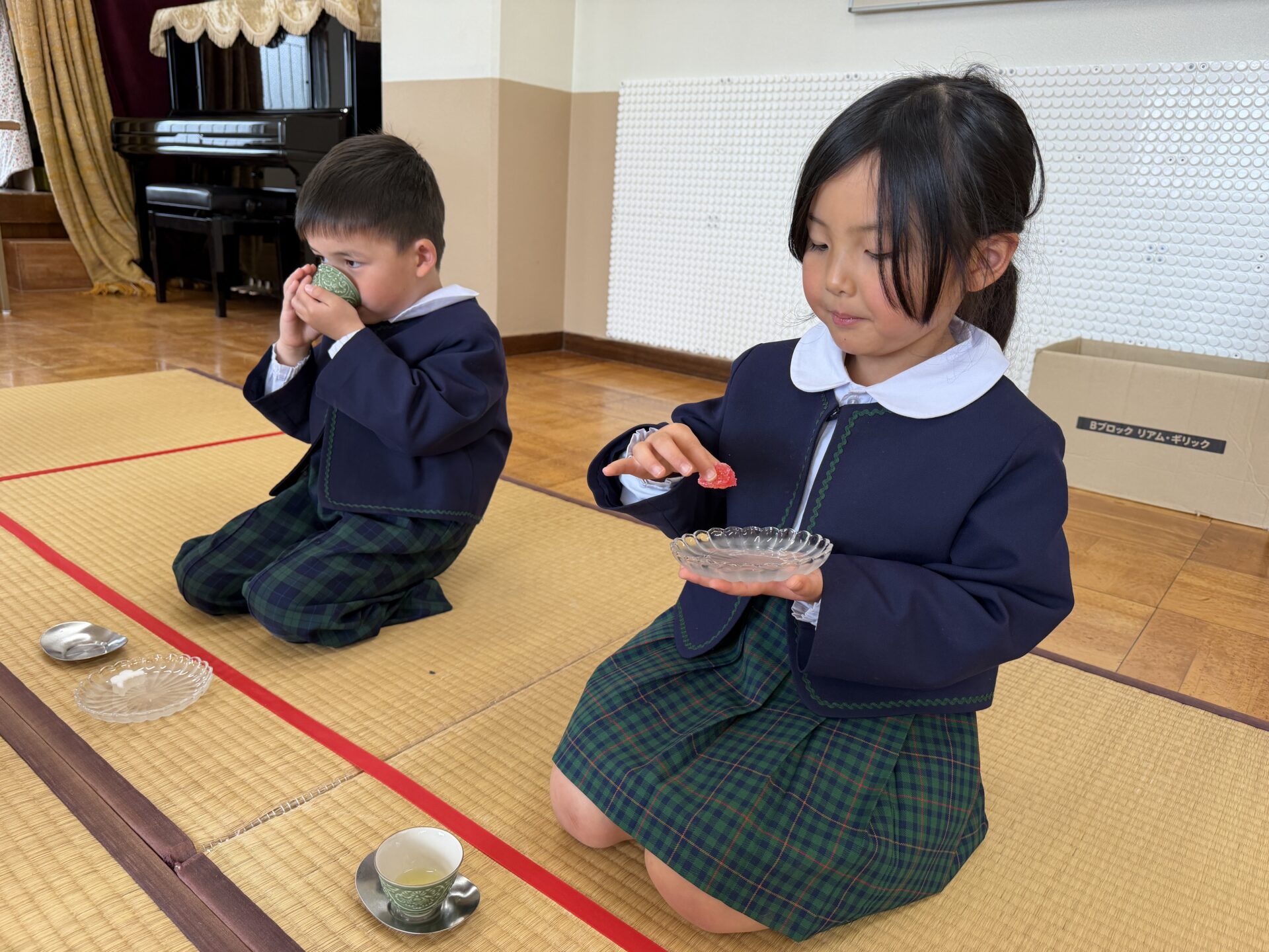 2026.04.24 園日記 初めてお茶会に参加したよ☆ うめ(年長)組のお友だちが、初めてお茶会に参加しました。はじめは少し緊張した様子の子どもたちでしたが、講師の先生に挨拶やお辞儀の仕方を教えていただくと、「むずかしいね!」とお話しながらも、一つひとつ丁寧に取り組んでいました☆その後は、お客さん役とお茶を運ぶ役に分かれて練習を行い、どちらの役にも意欲的に挑戦する姿が見られました♪ < 前へ 次へ > お知らせ・ブログ一覧へ