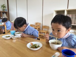 お給食の時間になると、カレーラーメンが登場し、スパイシーな香りに「おいしそう~!」「いいにおい!」と嬉しそうな子どもたち♪大好きなカレーライスとラーメンの組み合わせに喜びながら、夢中で食べていました。