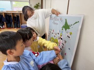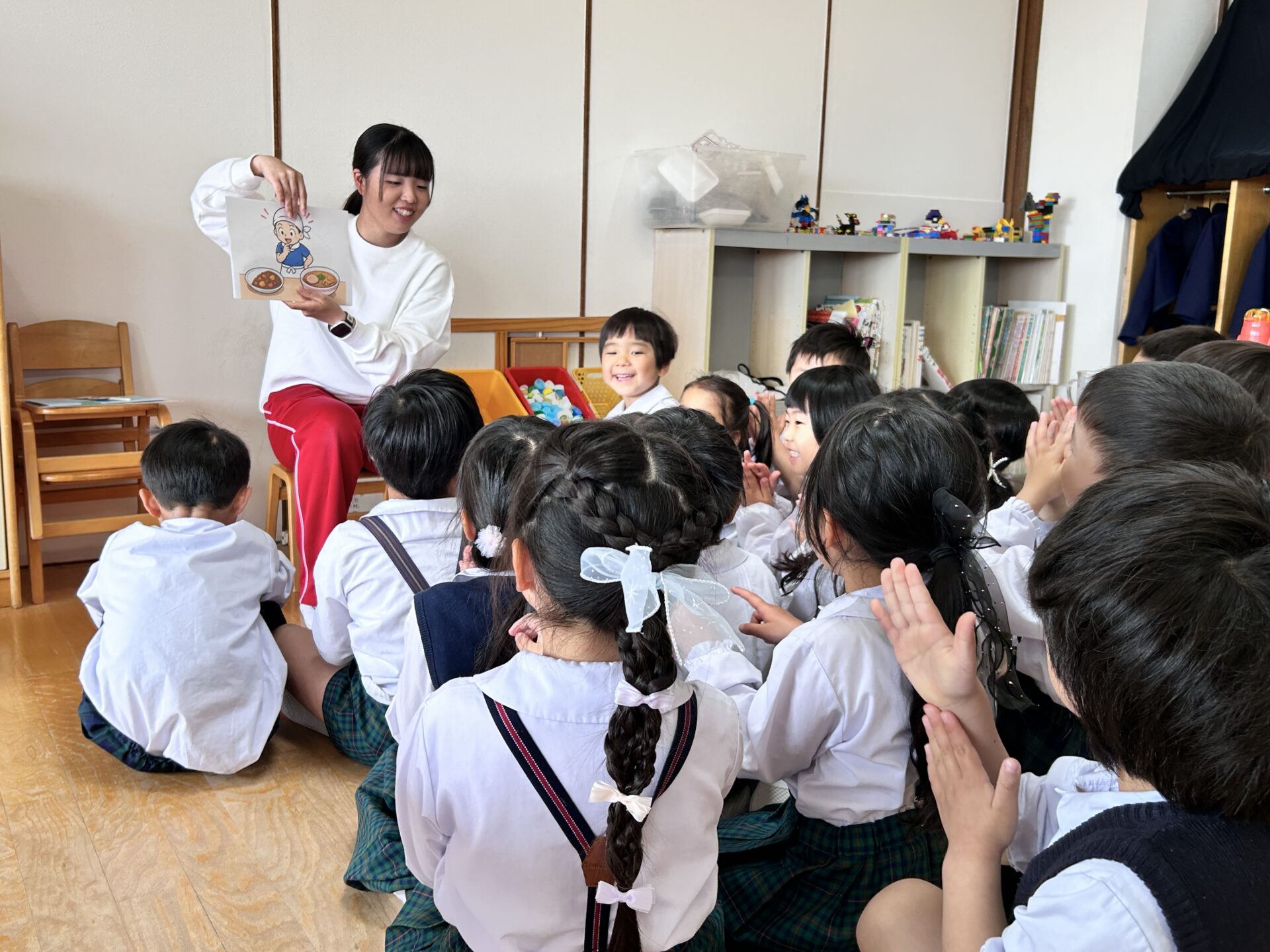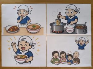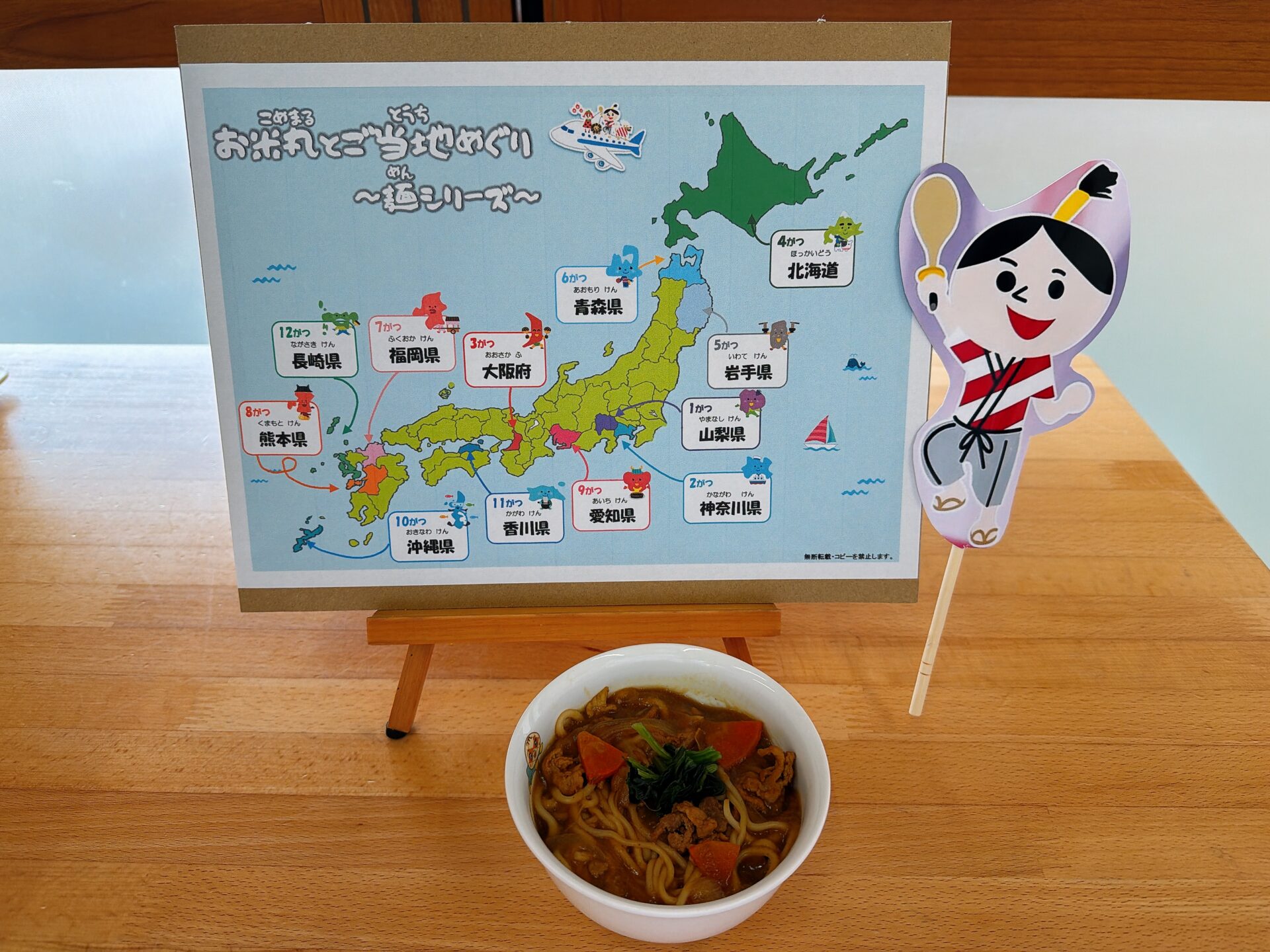 今月は、北海道の『カレーラーメン』が登場しました。ゆり(年中)組とうめ(年長)組のお友だちは、先生がAIを駆使して作った紙芝居を見ながら『北海道』と『カレーラーメン』についてのお話を聞き、「北海道って寒い所だよ!」「カレーライスとラーメンが合体したの?」とお友だちと話しながら、お給食の時間を楽しみにしていました。
