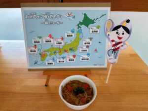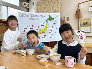 今年の給食室の食育活動のテーマは<お米丸とご当地めぐり~麺シリーズ~>です。毎月、日本各地の麺料理を味わいながら、楽しく食文化に触れていきます。子どもたちは、都道府県について調べたりお話を聞いたりしながら、それぞれの地域の特徴にも興味を広げています。さまざまな地域の麺料理に出会いながら、食べる楽しさや日本の食文化への親しみを深めていきたいと思います。