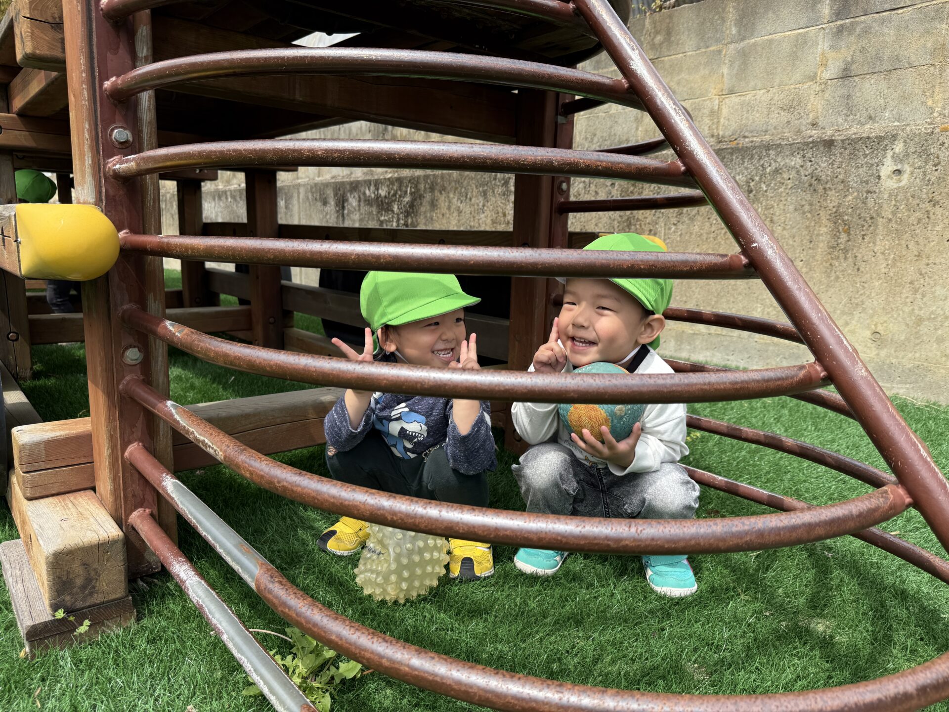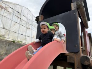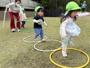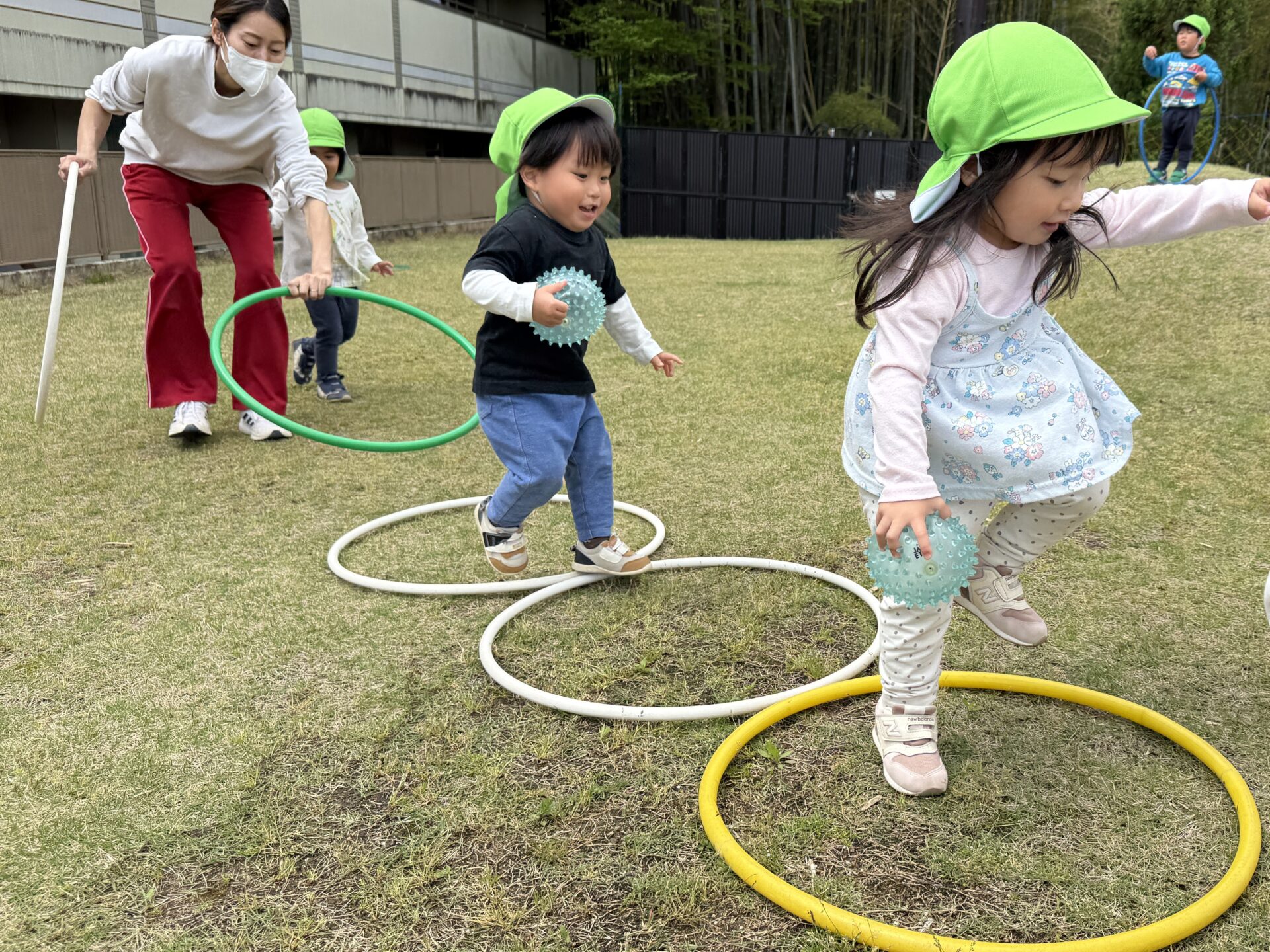 あたたかな日差しのもと、ちゅうりっぷ組(2歳児)のお友だちが芝生広場で元気いっぱい遊びました。滑り台をすべったり、フラフープを使ってジャンプ遊びをしたりと、それぞれが思い思いに楽しむ姿が見られました。お友だちと顔を見合わせて笑い合いながら、のびのびと体を動かして遊ぶ子どもたちの様子がとても微笑ましかったです♪